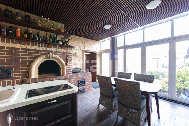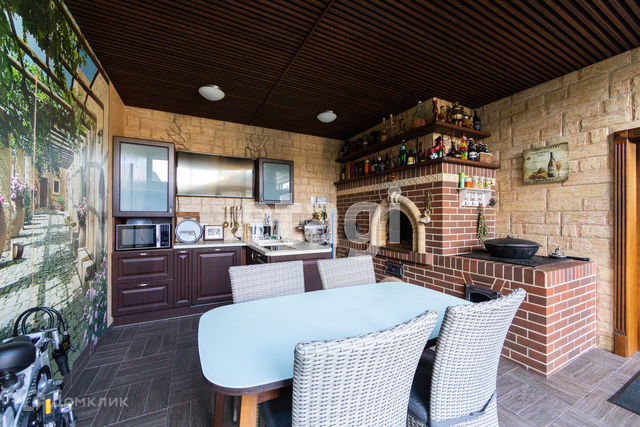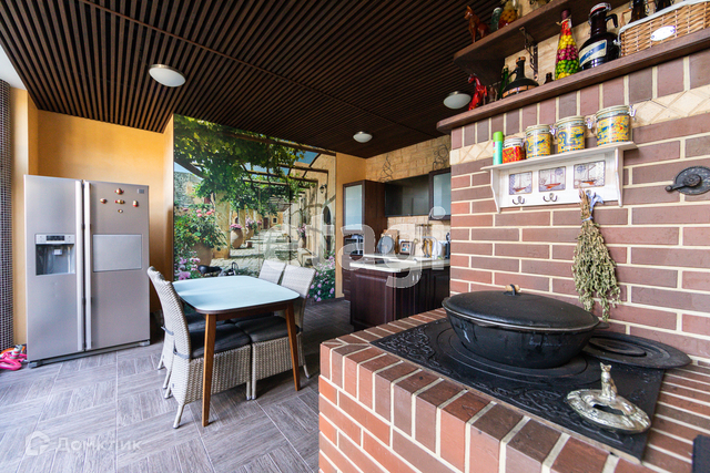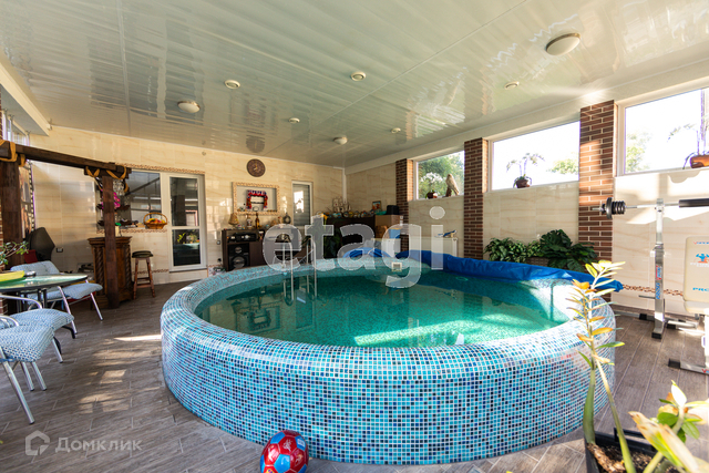 На территории расположен банный комплекс с бассейном общей площадью 240 кв.м. Везде теплые полы, деревянные лестницы из ясеня. Есть печь-мангал из кирпича в кухонной зоне и зона барбекю на улице. Большой бассейн с подогревом и очисткой с зоной отдыха и тренажёрами.