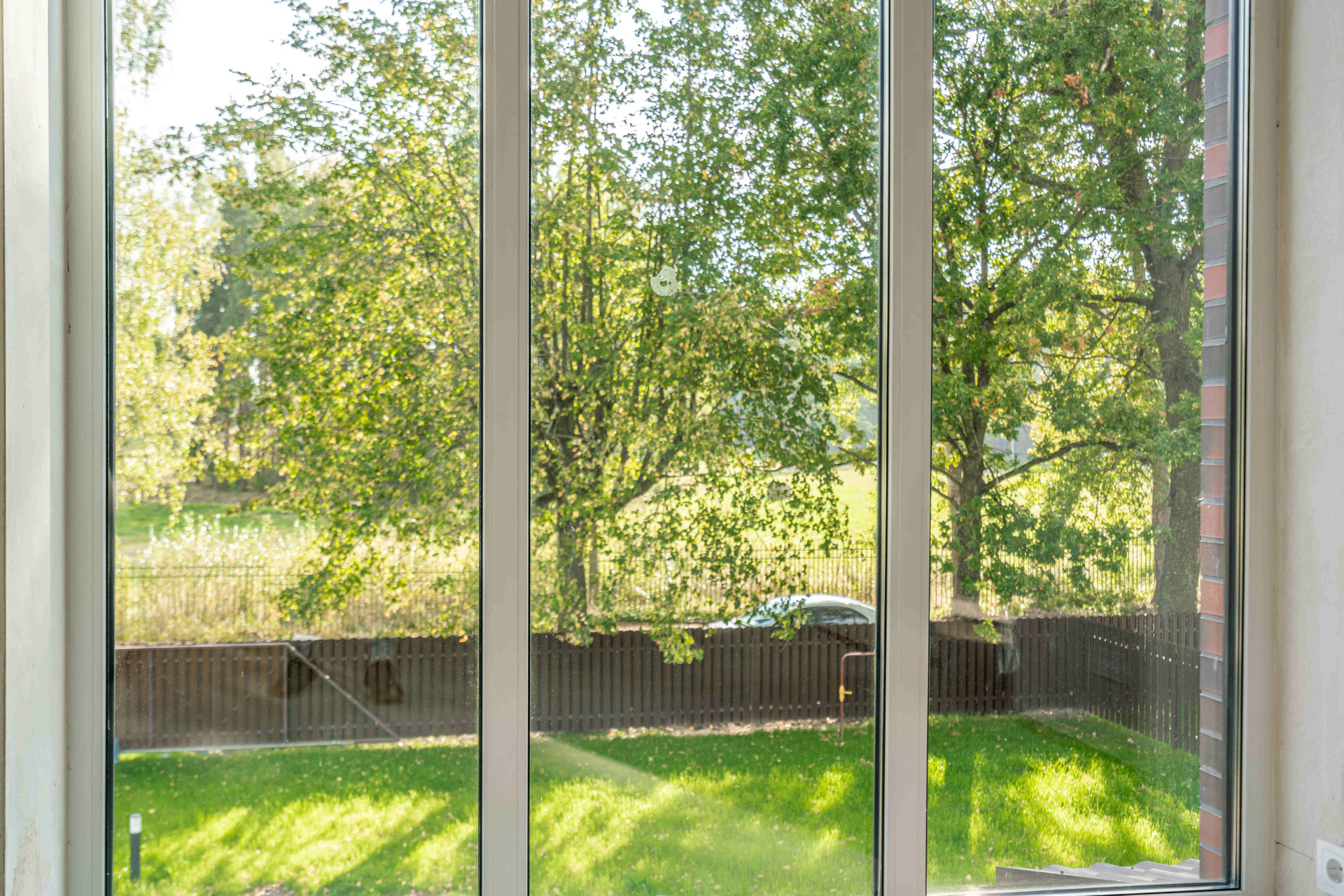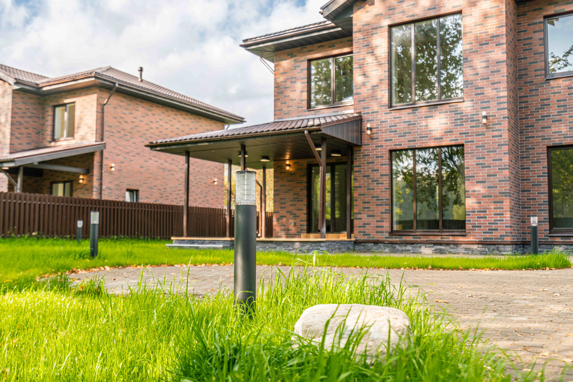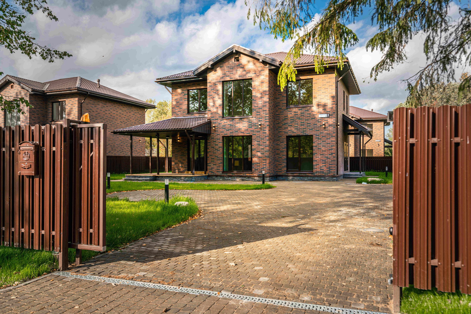 На территории предусмотрен ландшафтный дизайн с привлекательным газоном, освещением, дорожками, парковочными местами и функциональными откатными воротами.