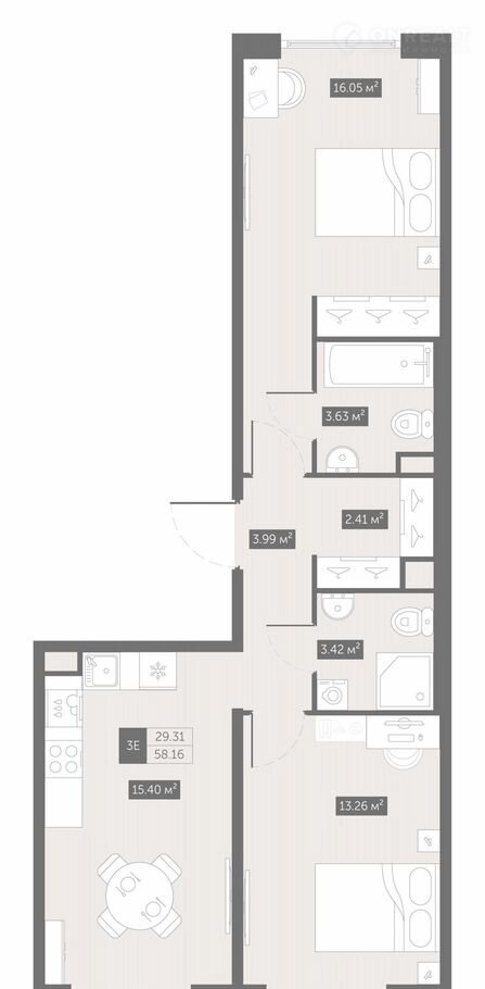 Общая площадь 58.2 м2