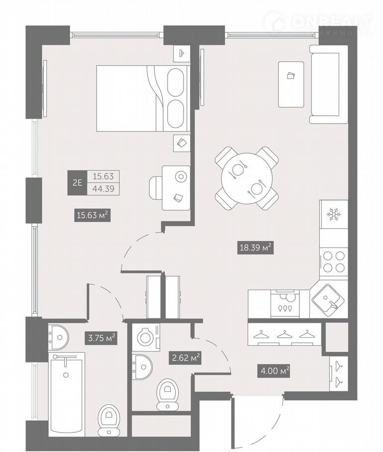 Общая площадь 44.4 м2