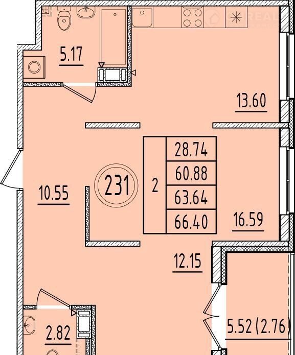 Общая площадь 60.9 м2