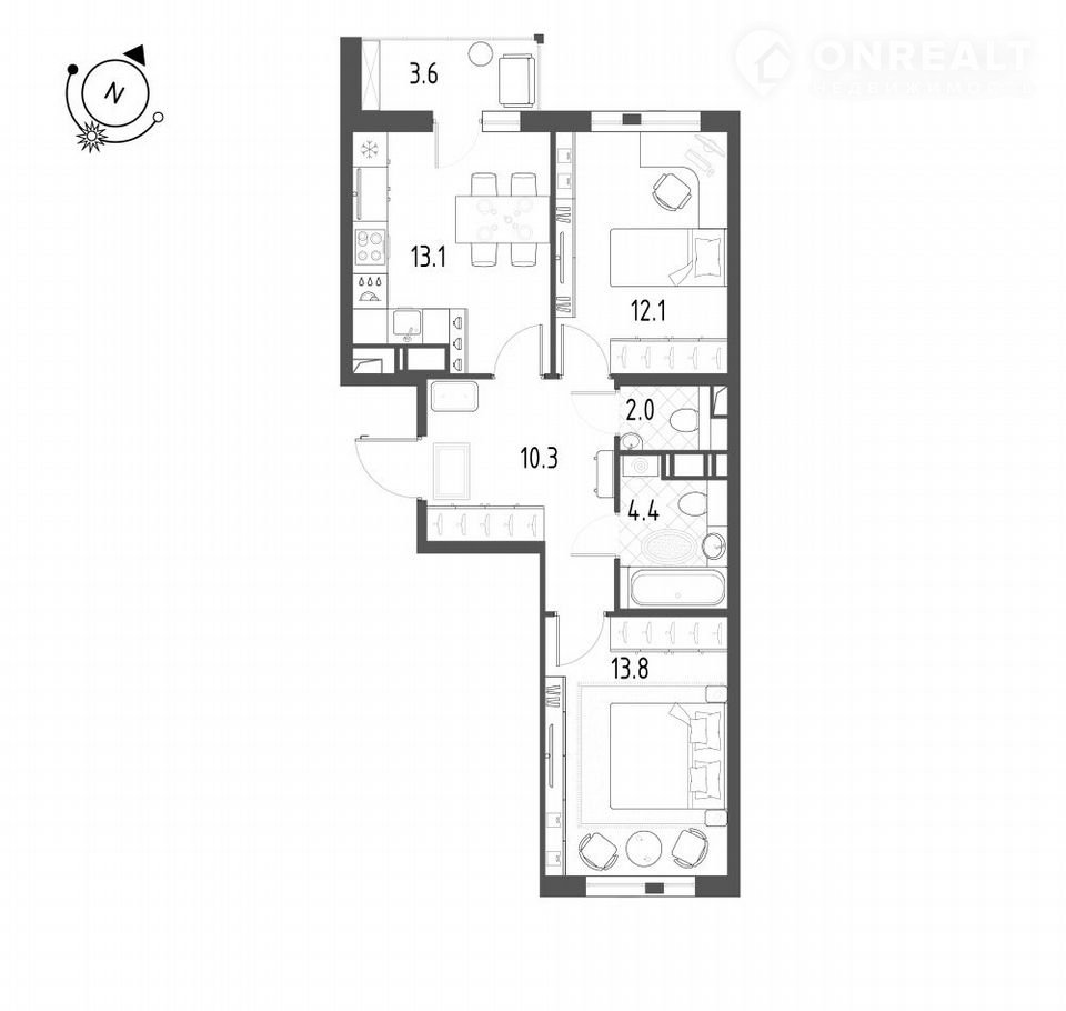 Общая площадь 57.8 м2