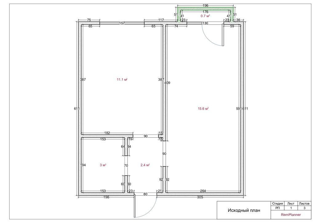 Площадь 32 м2, просторная кухня 11,1 м2, комната 15,6 м2 с балконом.