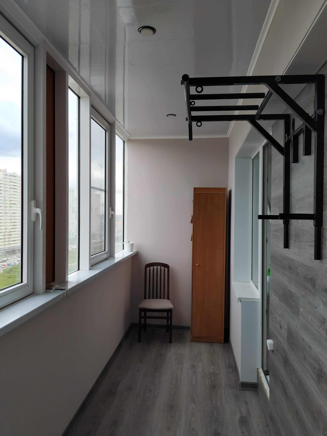 На лоджии косметический ремонт: утепление внешних панелей, ламинат, выравнивание и окраска стен, потолок, розетка, свет.
