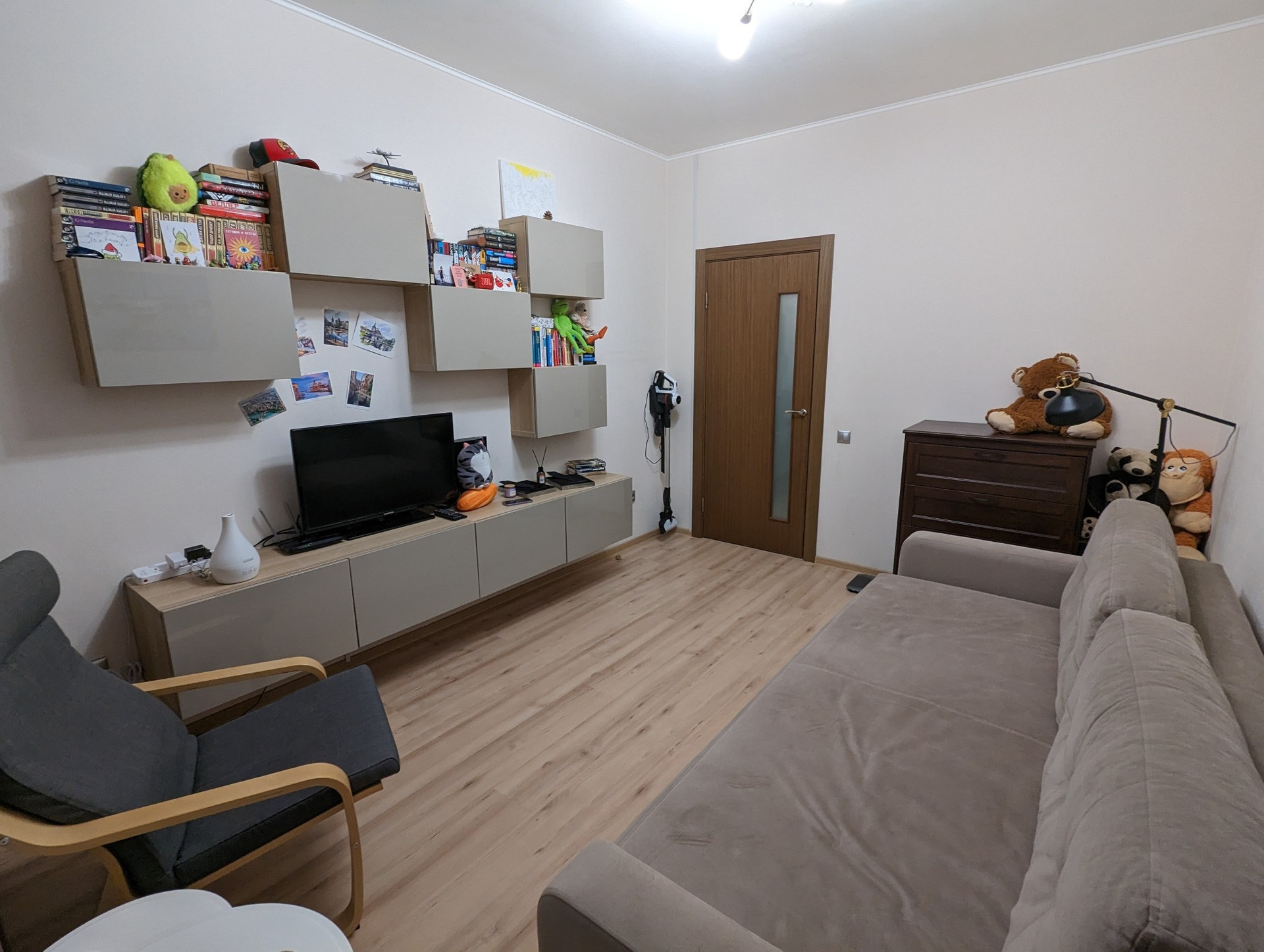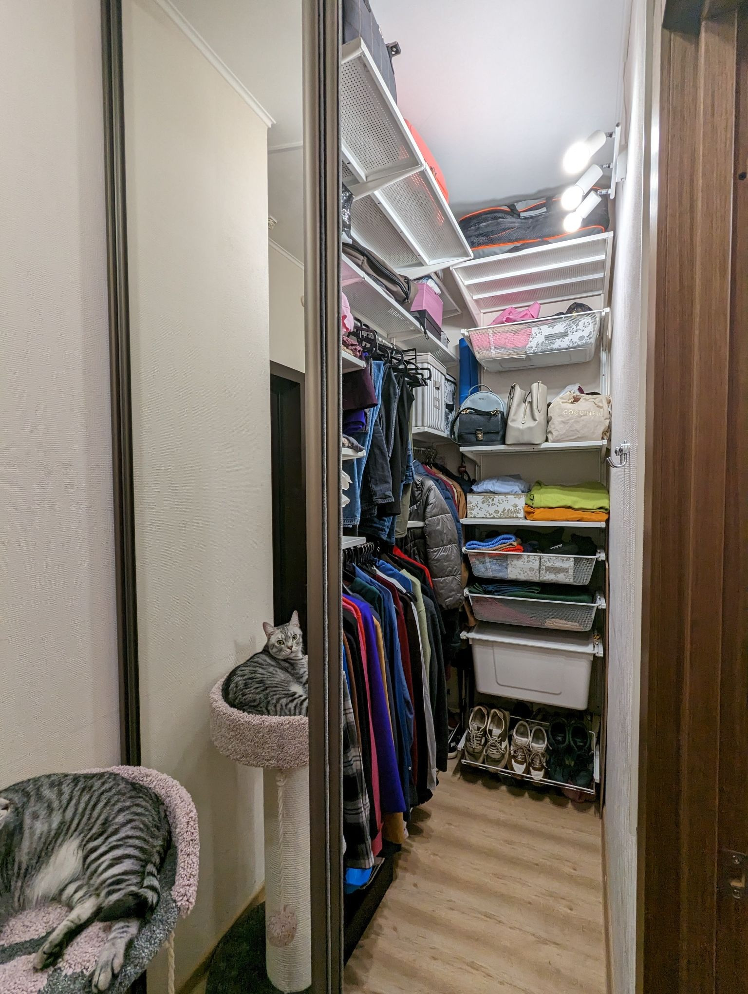 Сделана вместительная гардеробная: система хранения ИКЕА, свет, двери-купе.