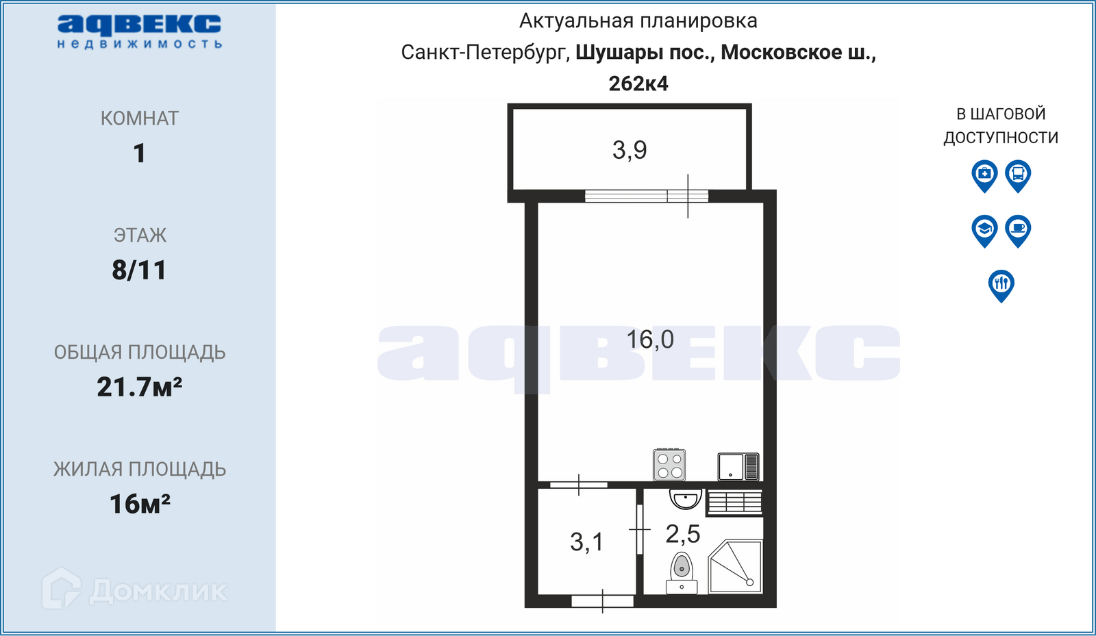 Общая площадь 21.7 м2