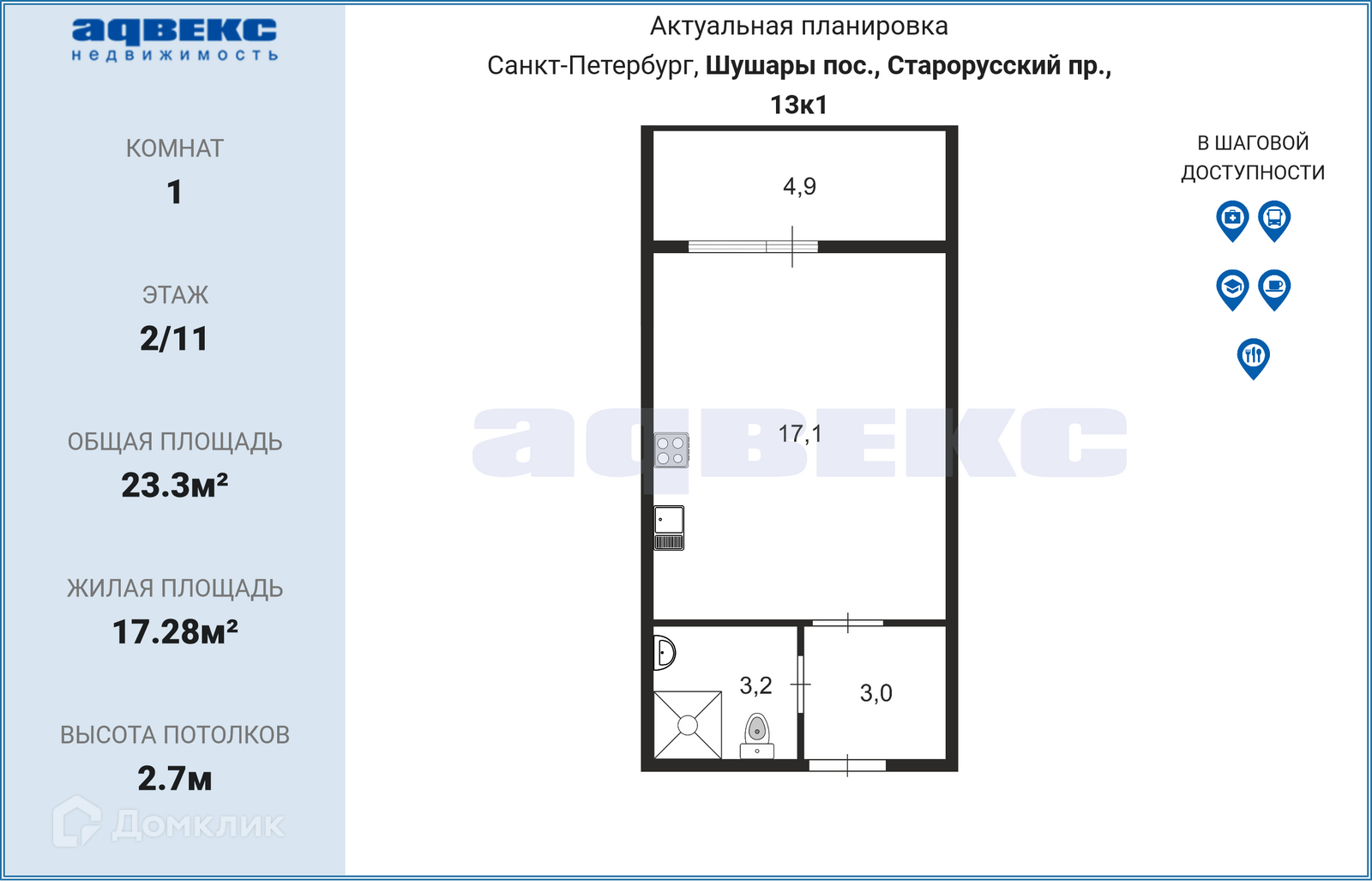Общая площадь 23.3 м2