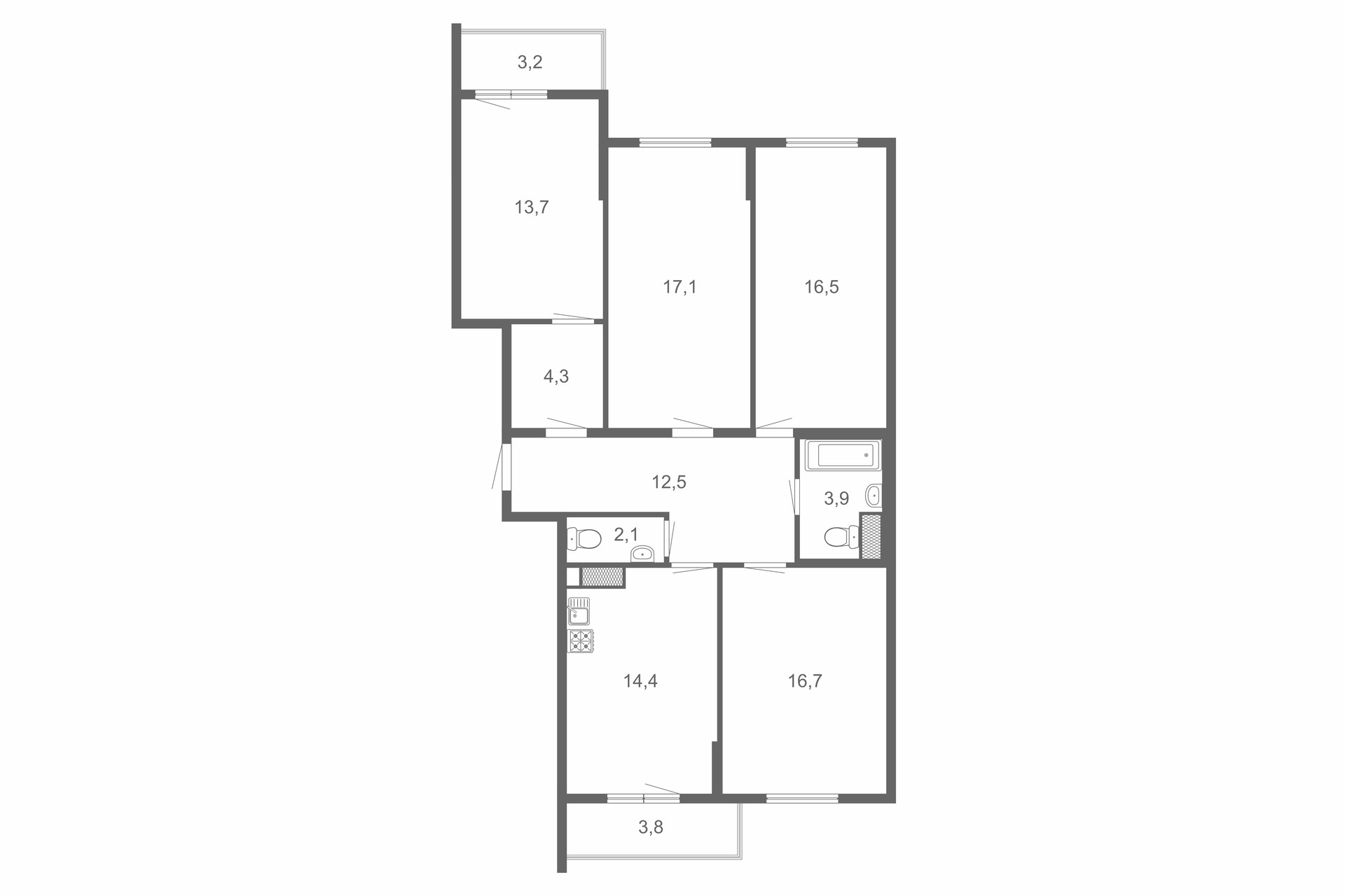 В продаже просторная двухсторонняя квартира площадью 101 м2.