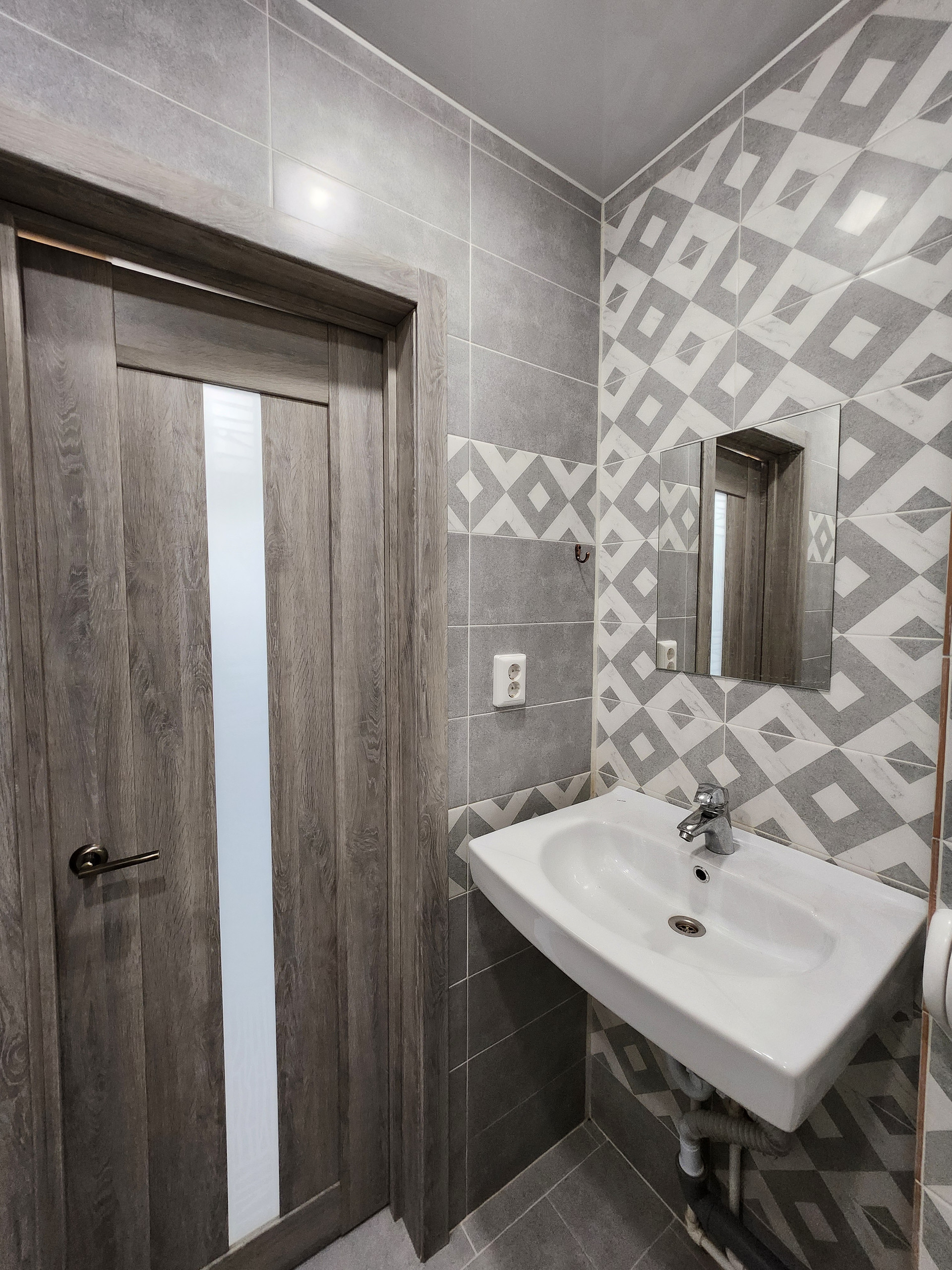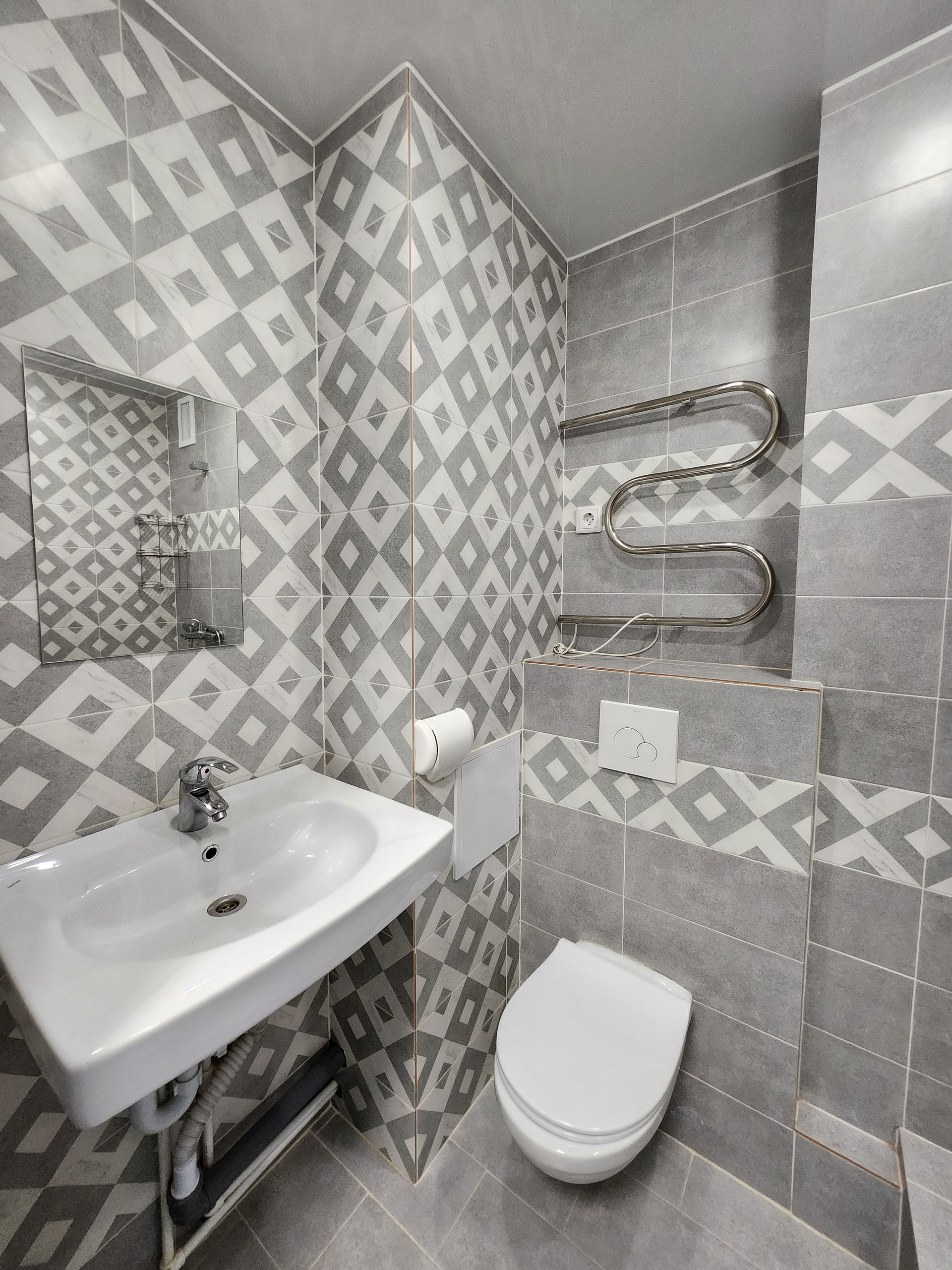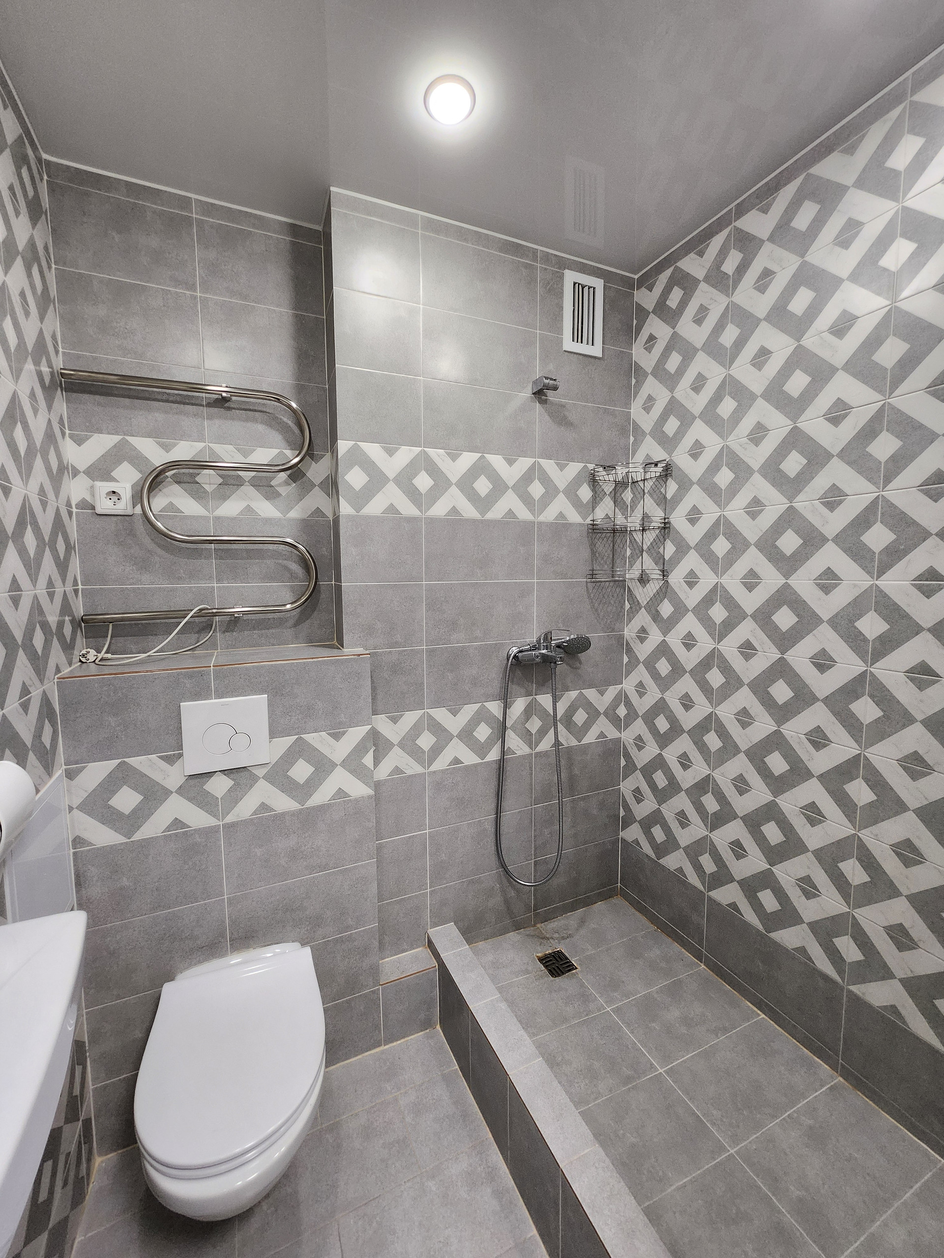 >санузел в плитке до потолка, сантехника качественная, под раковиной имеется место для стиральной машины
