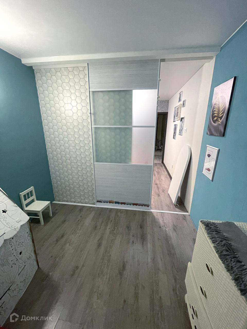В квартире сделана перепланировка(из большой комнаты - спальня и детская), возведена стена и установлена дизайнерская дверь-купе.