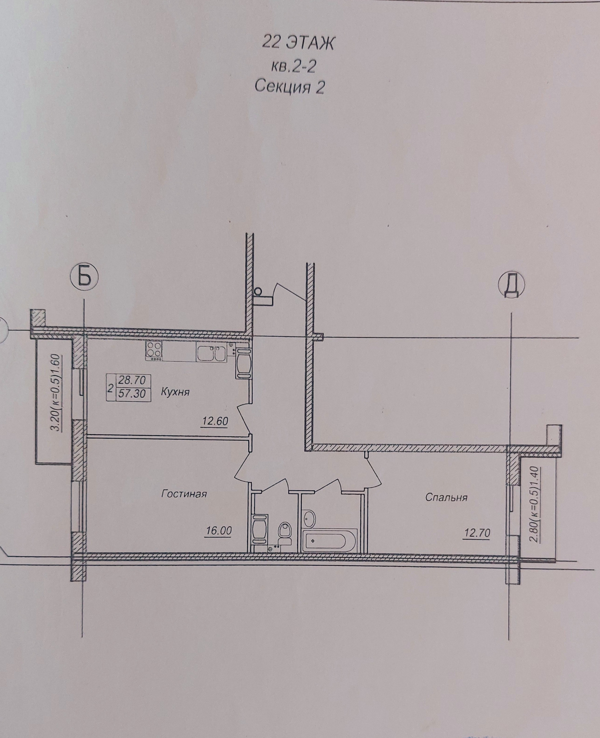 Общая площадь 57.4 м2