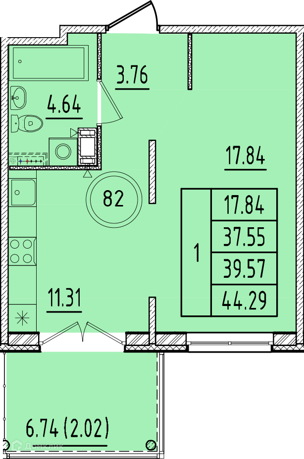 Общая площадь 37.55 м2