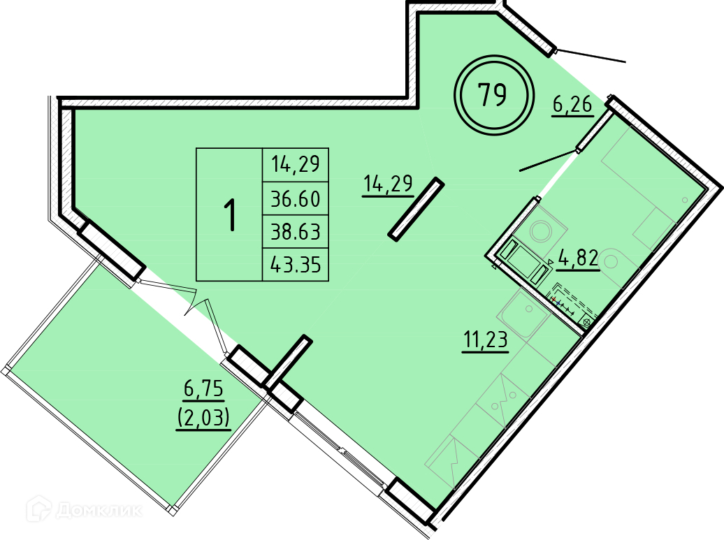Жилая площадь 14.29 м2