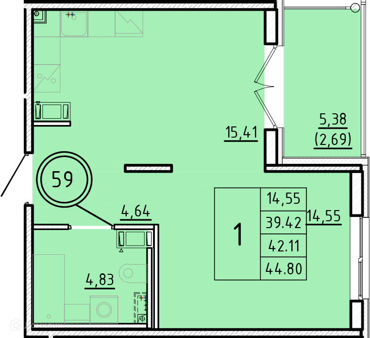 Общая площадь 39.57 м2