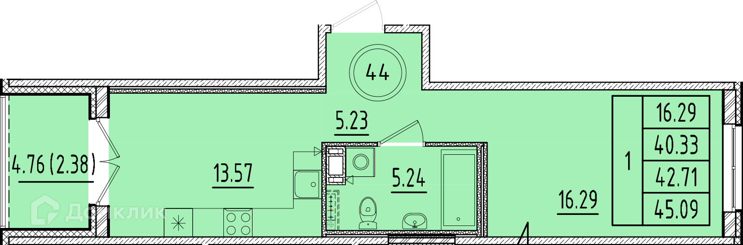 Общая площадь 40.33 м2