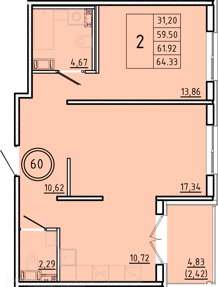 Общая площадь 59.75 м2