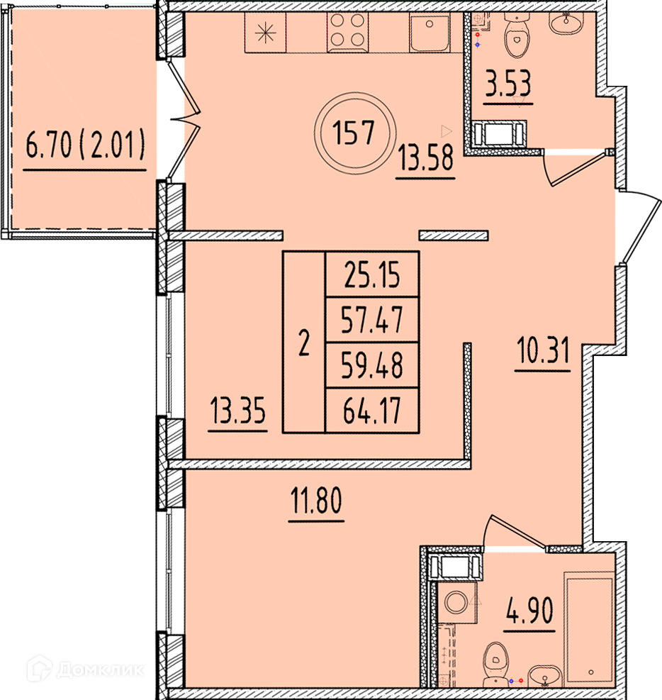 Общая площадь 57.47 м2