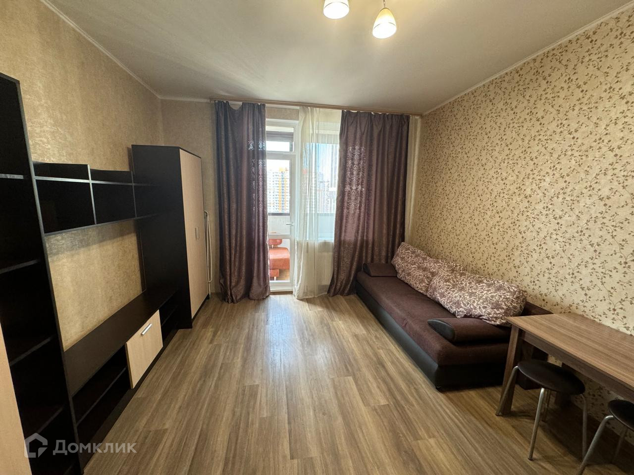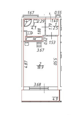 Рациональная планировка: комната 18,9 кв.м., просторный санузел, широкий застекленный балкон 5кв.м. идет бонусом к общей площади 25,5 кв.м, окна выходят во двор (не в сторону КАД).