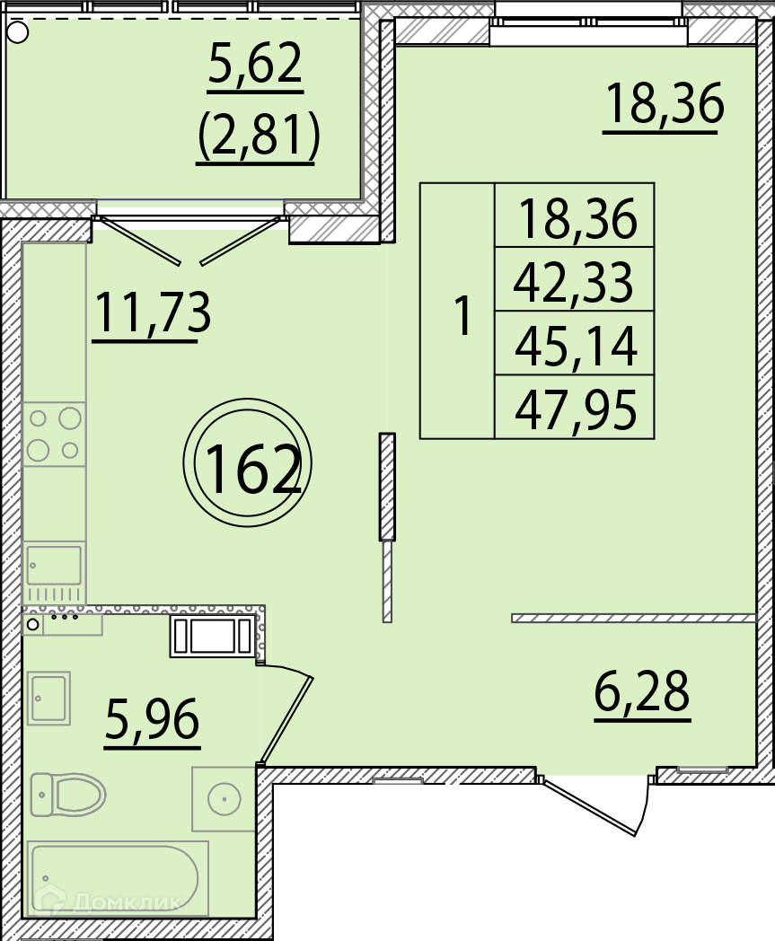 Общая площадь 42.33 м2