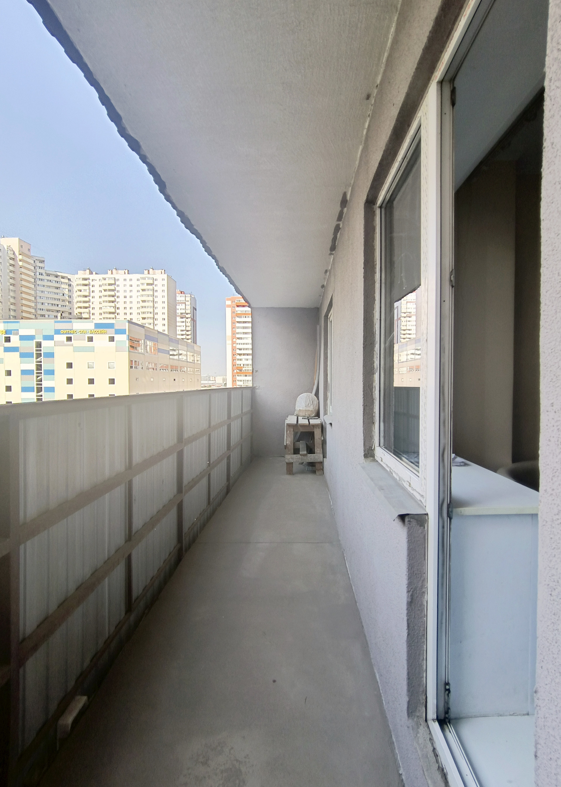 -  Широкий не застекленный балкон вдоль комнаты и кухни 8.6 м2.