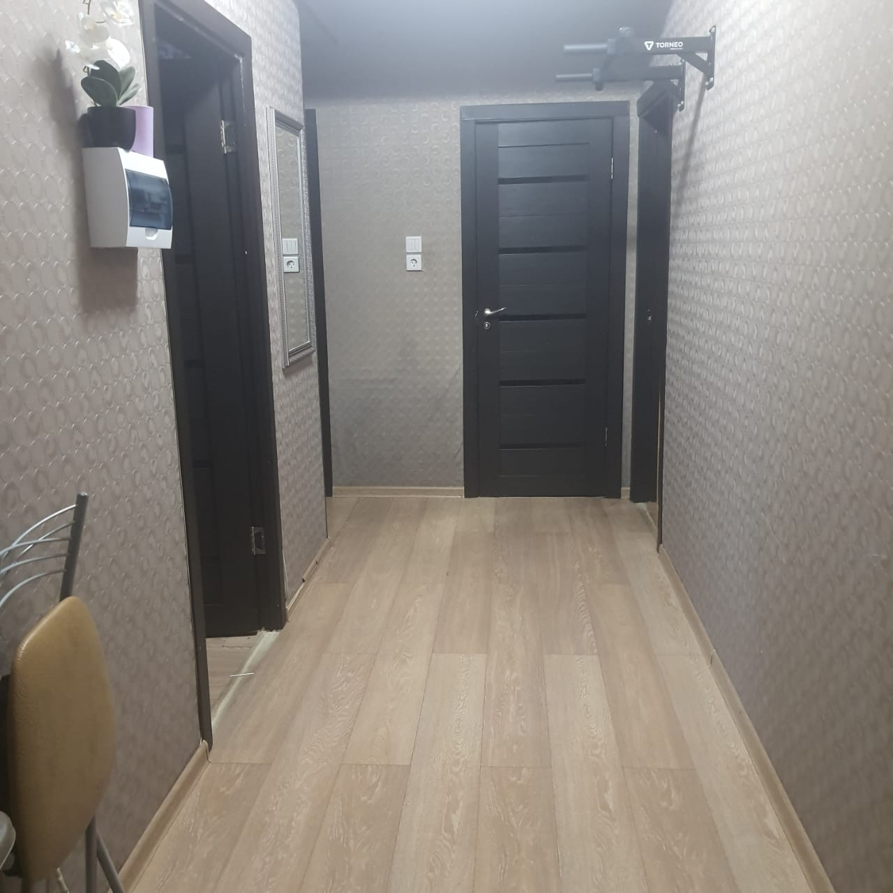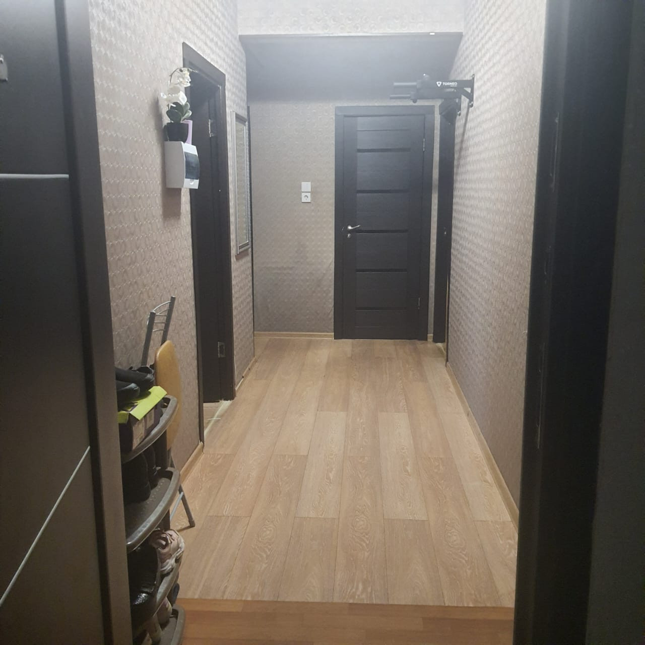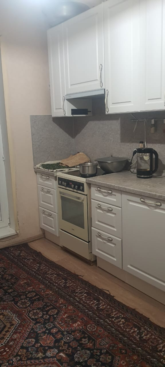 Квартира требует косметического ремонта, Есть балкон(1 этаж) застеклен, утеплен и облагорожен. В комнатах и на кухне на полу ламинат, в санузле плитка на полу. На окнах 2-х камерные стеклопакеты , установлены межкомнатные шпонированные двери .Встроенная кухня остается в подарок покупателю.