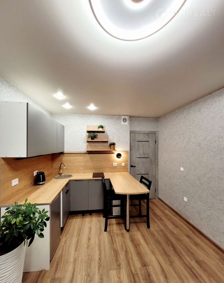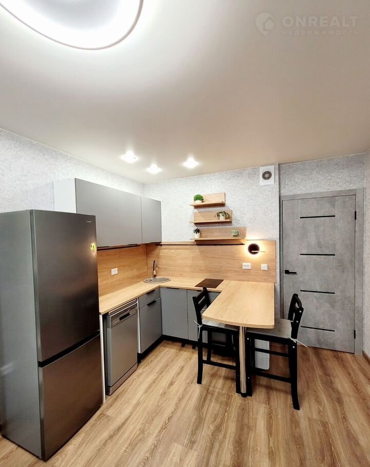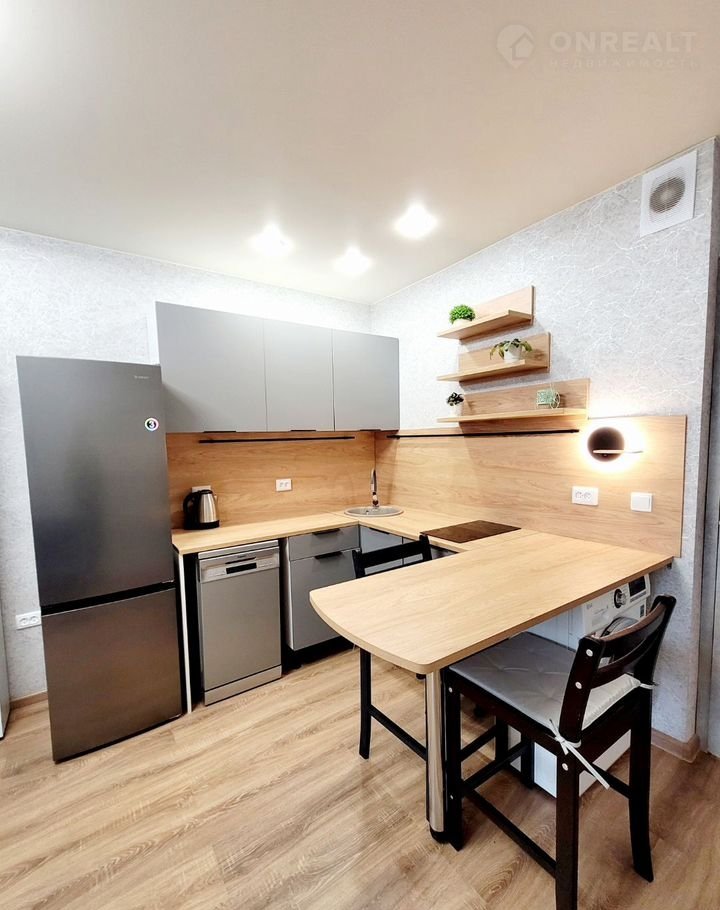 Для комфортного проживания установлен полноценный кухонный уголок со встроенной варочной поверхностью, барной стойкой и посудомойкой.