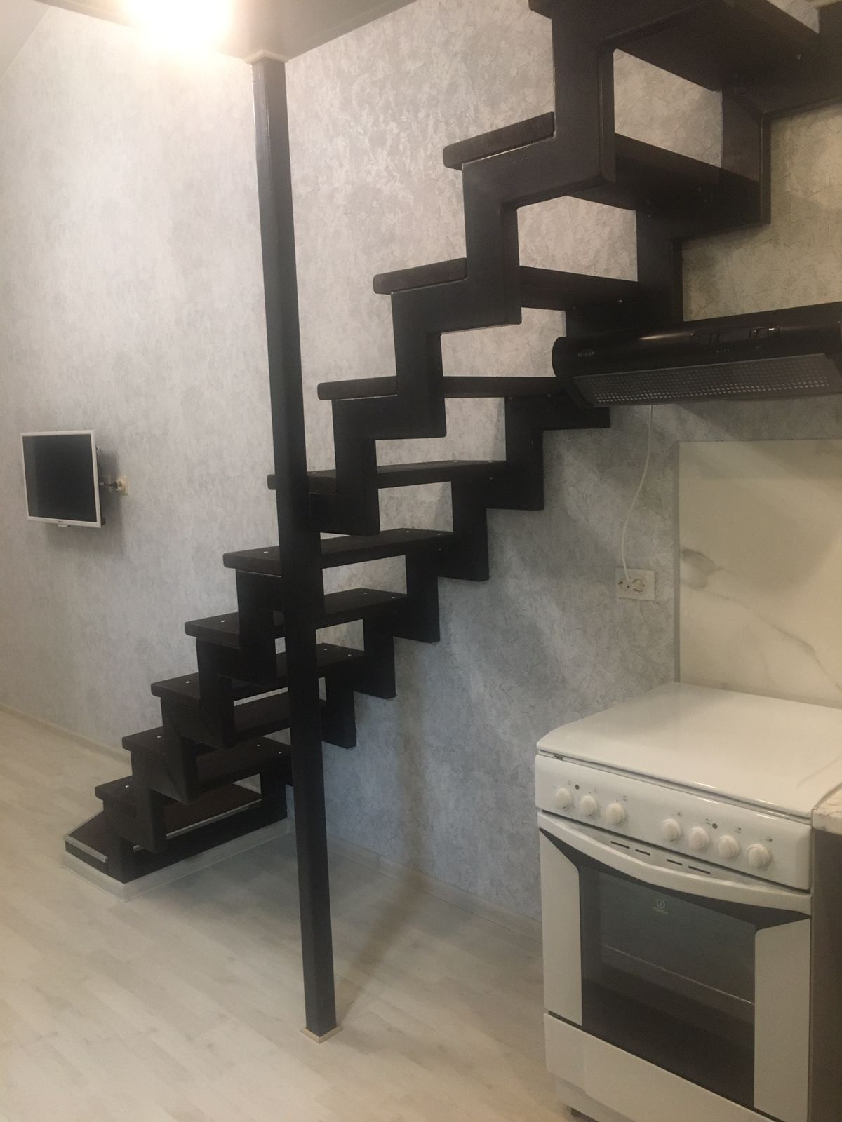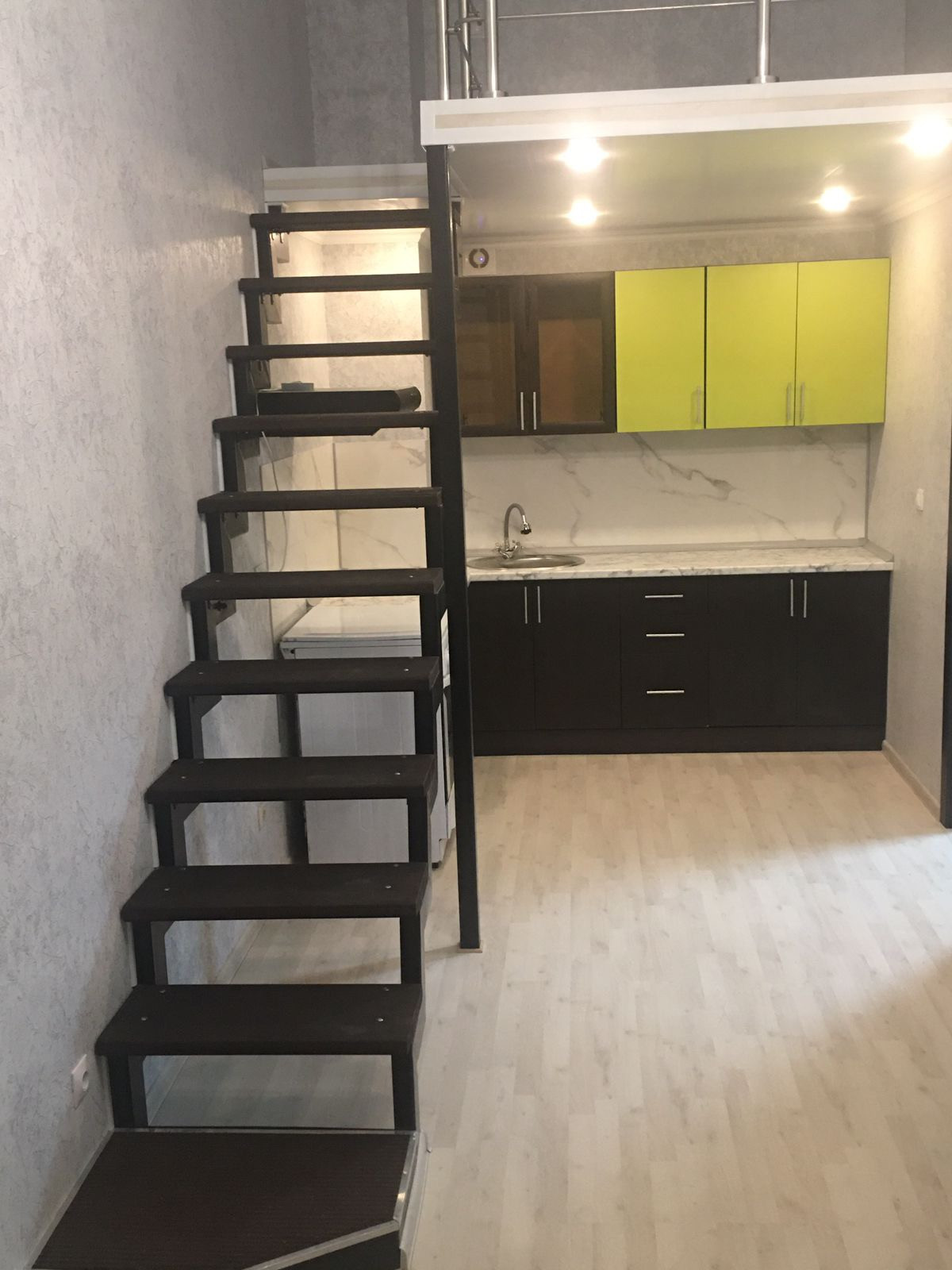 Внизу : кухня- гостиная 19 кВ, спальня 12кв, санузел совмещённый.
