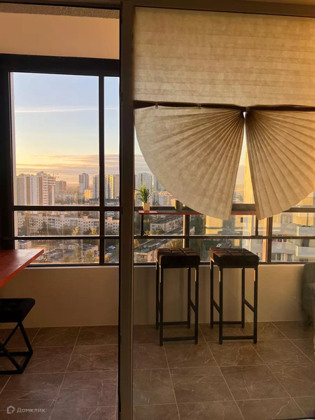 Панорамное остекление на лоджию, где организовано рабочее место и место для отдыха, теплый пол на лоджии.