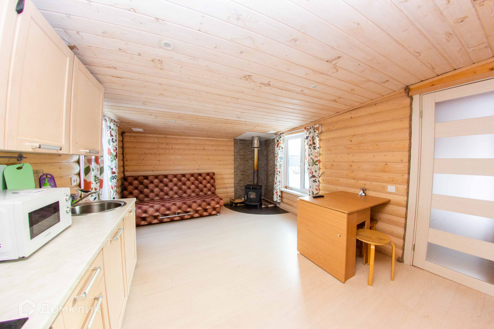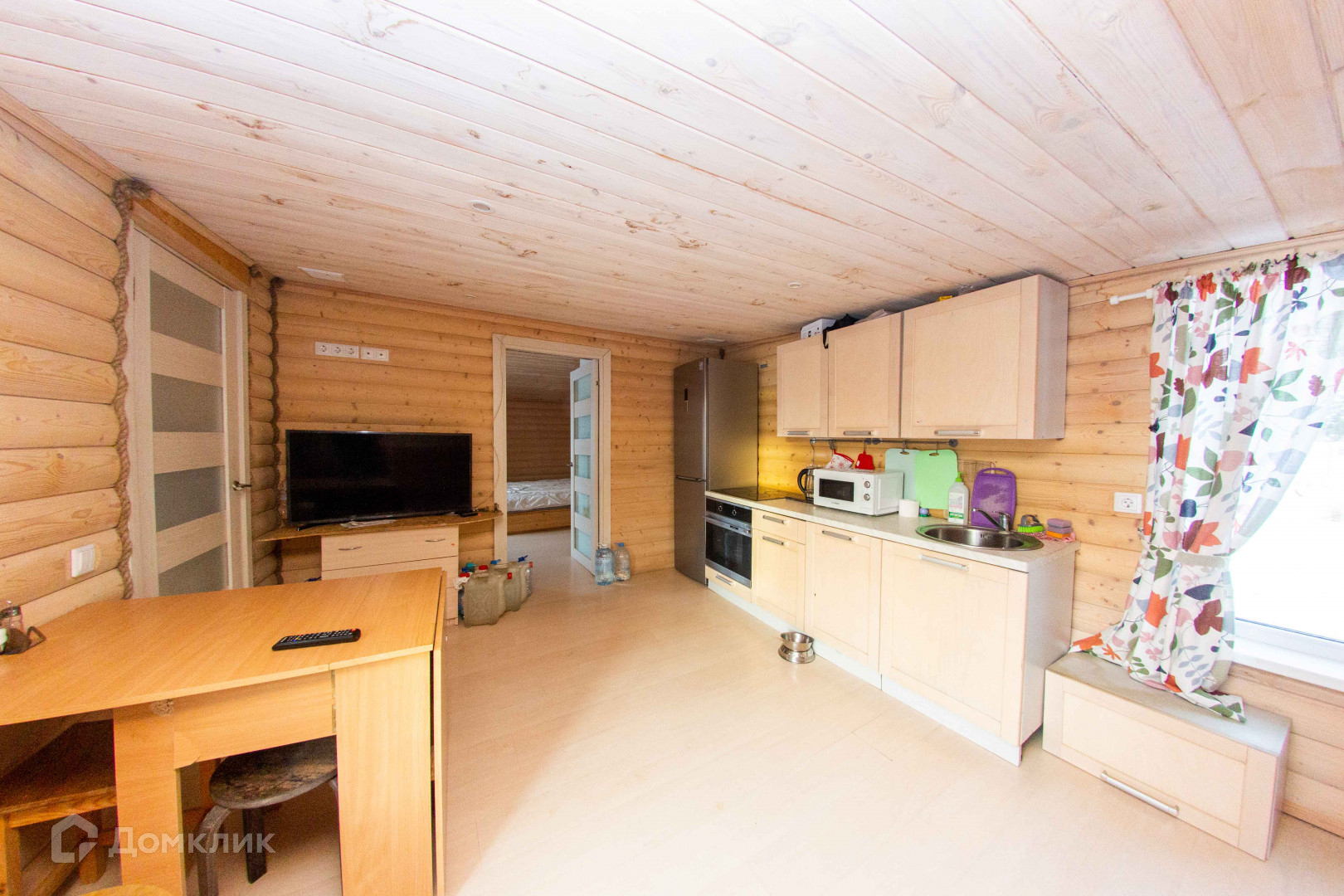 Кухня-гостиная с печкой и спальня. Внутри и снаружи обшит имитацией бруса. Санузел совмещен, облицован плиткой. Установлен бойлер на 100 литров,сантехника. Так же имеется гардеробная. Коммуникации в дом заведены.