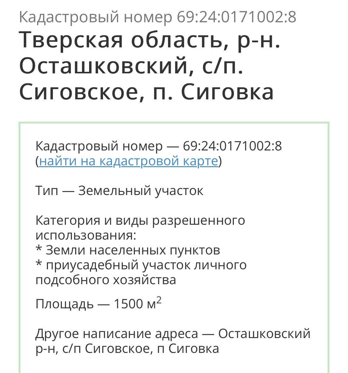 Проведено электричество, в деревню заведен природный газ. Участок в долгосрочной аренде. Кадастровый номер 69:240171002:8