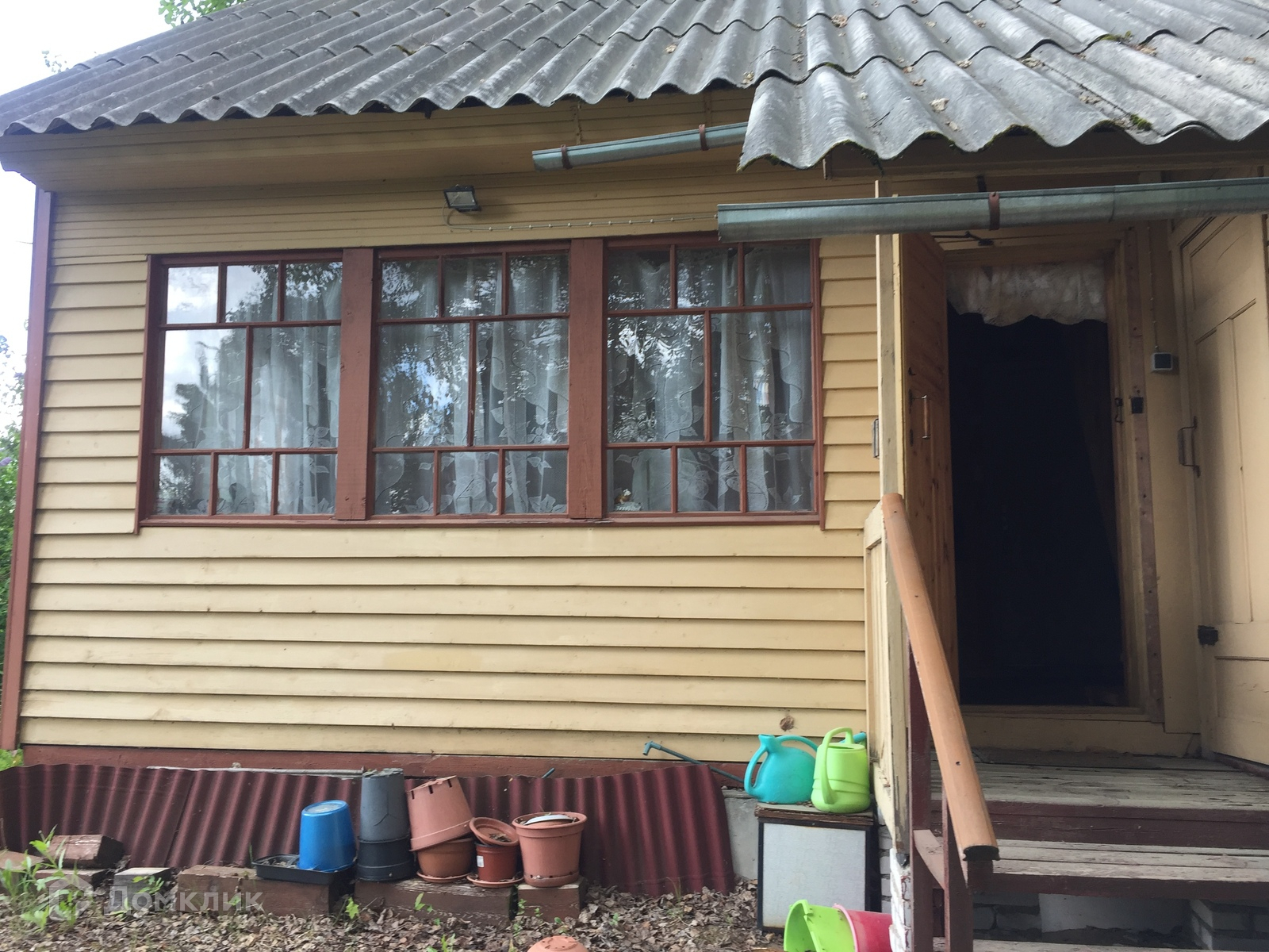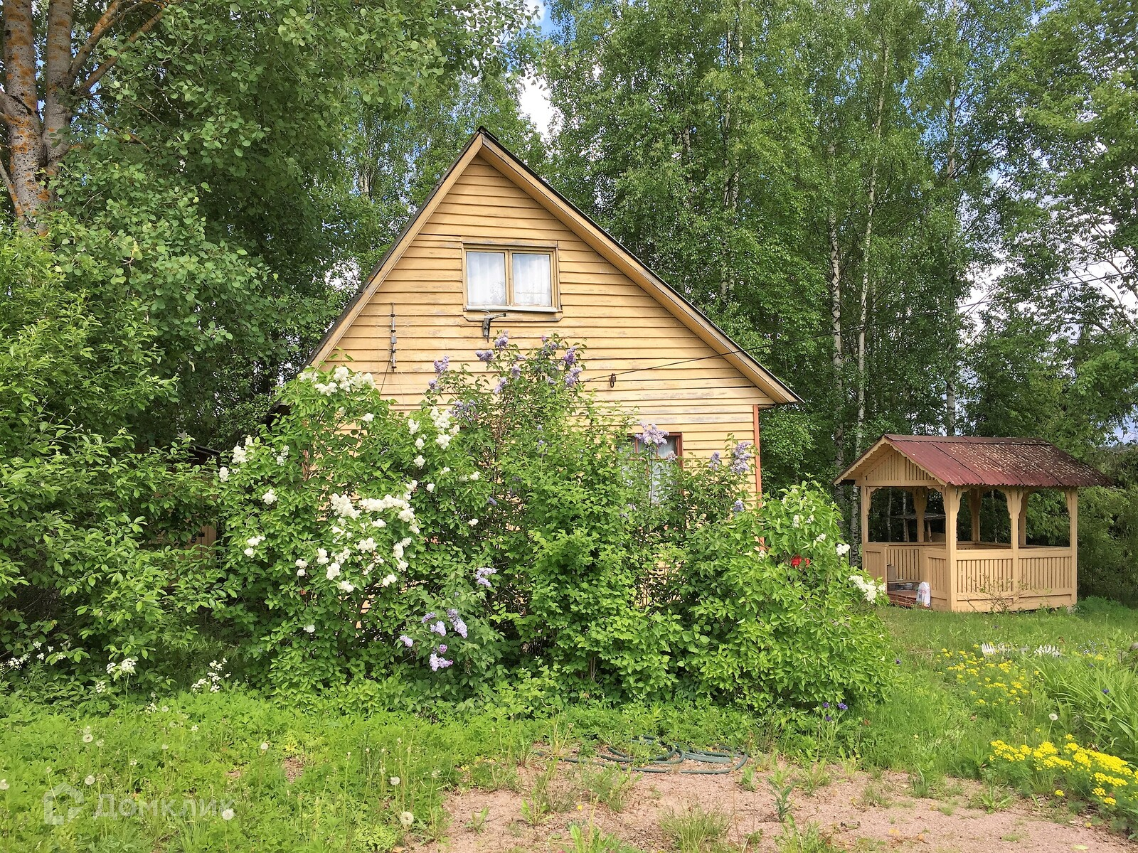 В 45 км от Санкт-Петербурга по прекрасной асфальтовой дороге, включая "Скандинавию", Вы можете за 35-40 мин добраться до поселка Симагино, где располагается СНТ"Симагино". Въезд на территорию  закрыт, стоит шлакбаум. Участок 7,35 соток разработан, цветы, березы, сирень.  Дом очень удачно расположен, так как из окон открывается вид на поле и лес.Площадь дома значительно больше. чем по документам. (65 кв.м.) В доме на 1-ом этаже 4 комнаты и кухня. На Мансарде еще одна комната . Санузел - биотуалет в доме. Еще один биотуалет в отдельном помещении на участке. Водопровод летний, заведен в дом. Есть баня, хозяйственная постройка и беседка.