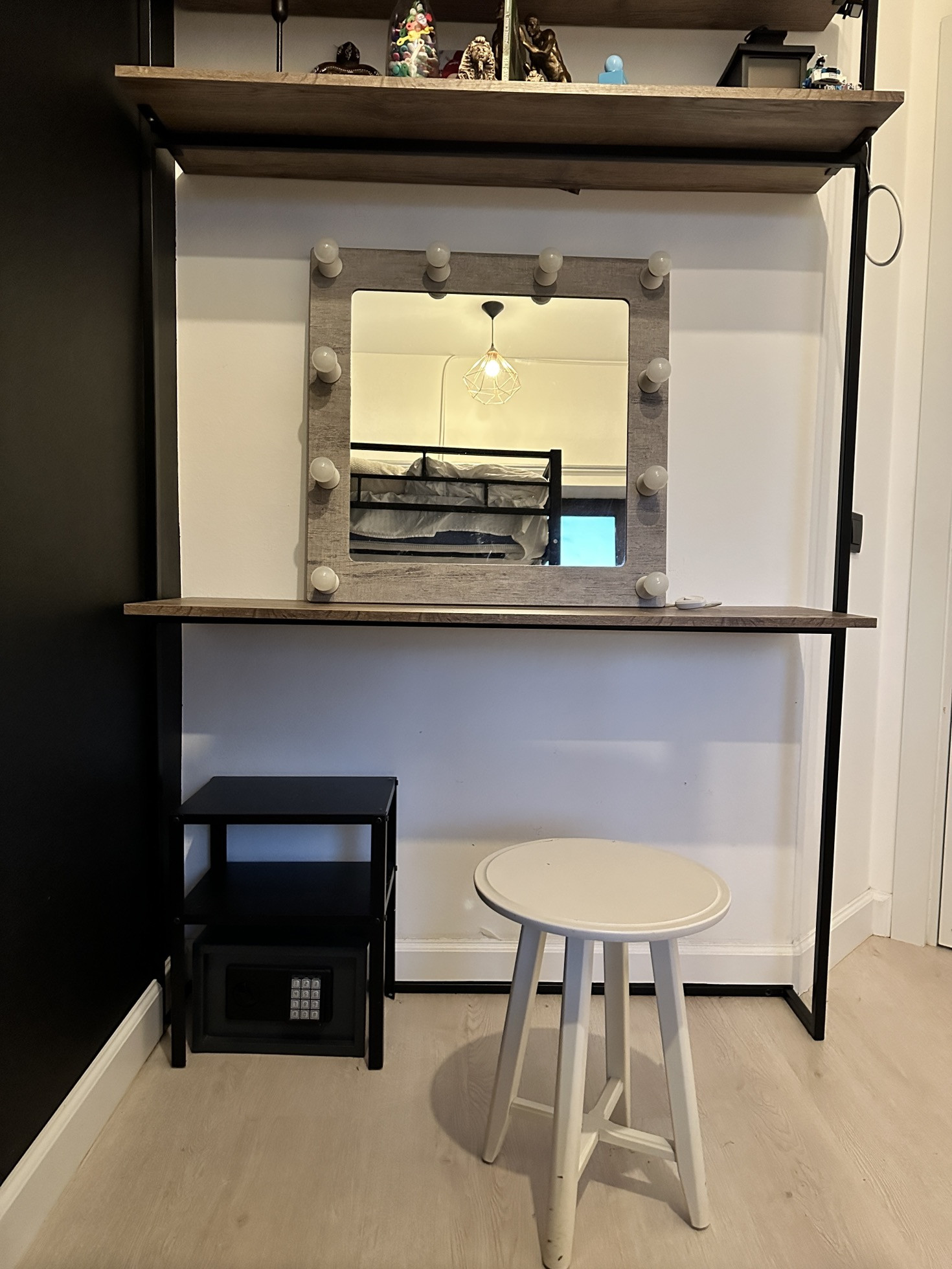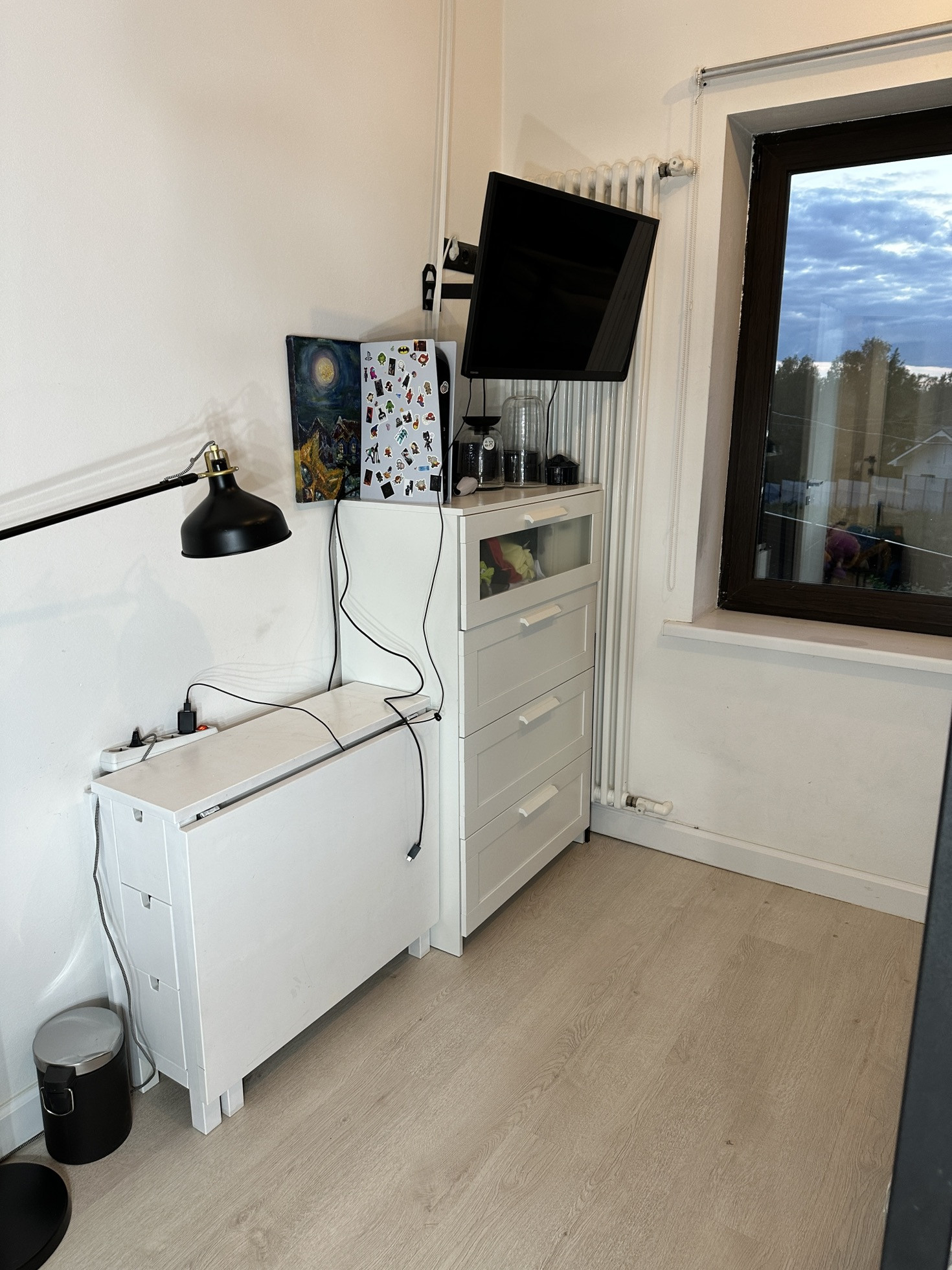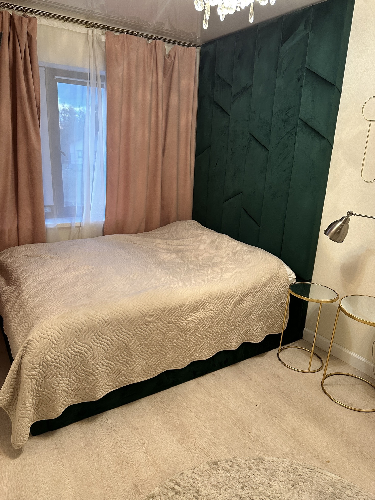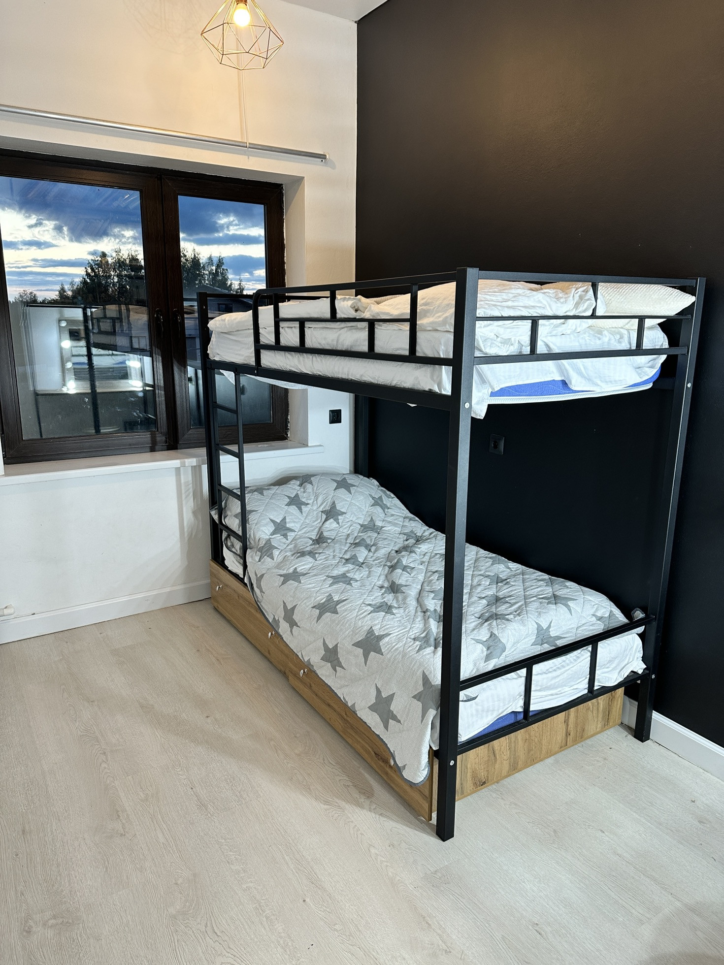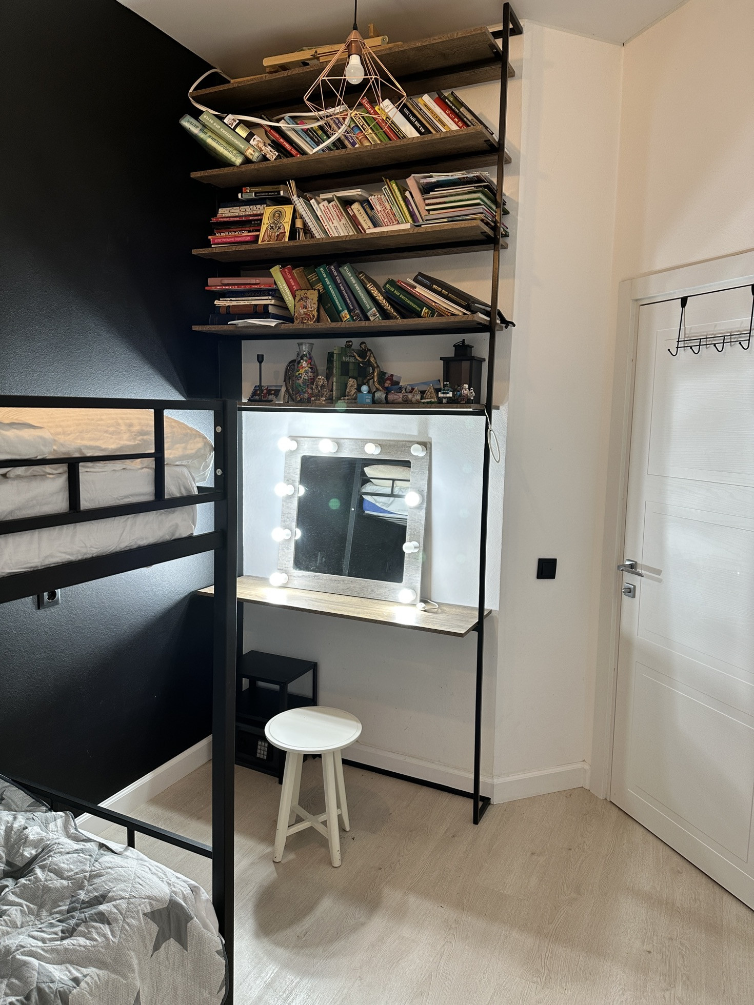 В детской комнате сейчас двухъярусная кровать с ортопедическими матрасами. Раньше стояла двухспальная и было тоже шикарно (постараюсь приложить фото). Помимо кровати с ящиками для хранения, имеется туалетный столик с библиотечной полкой, письменный стол (раскладывается в огромный), высокий комод, вешалка, телевизор.
