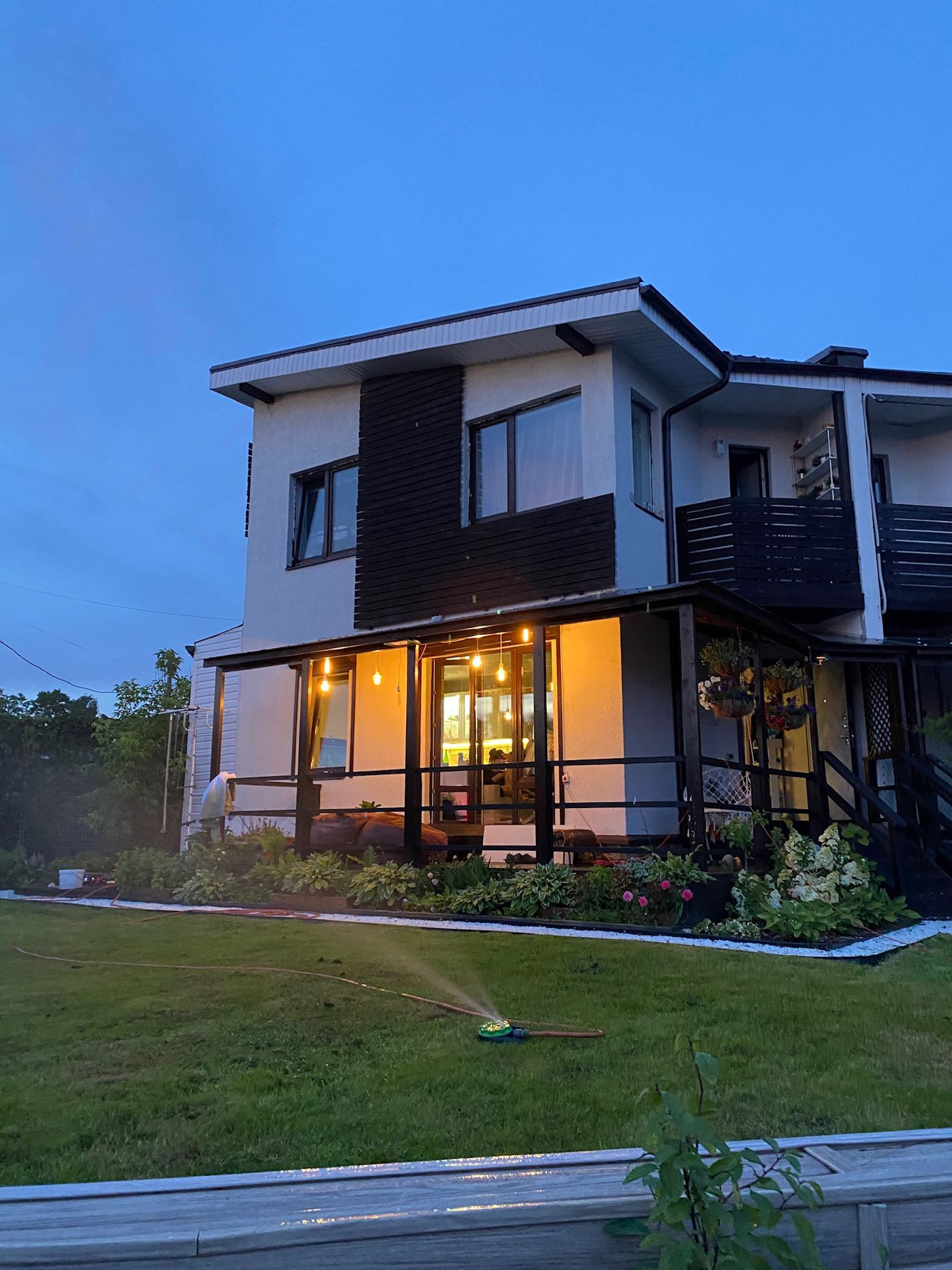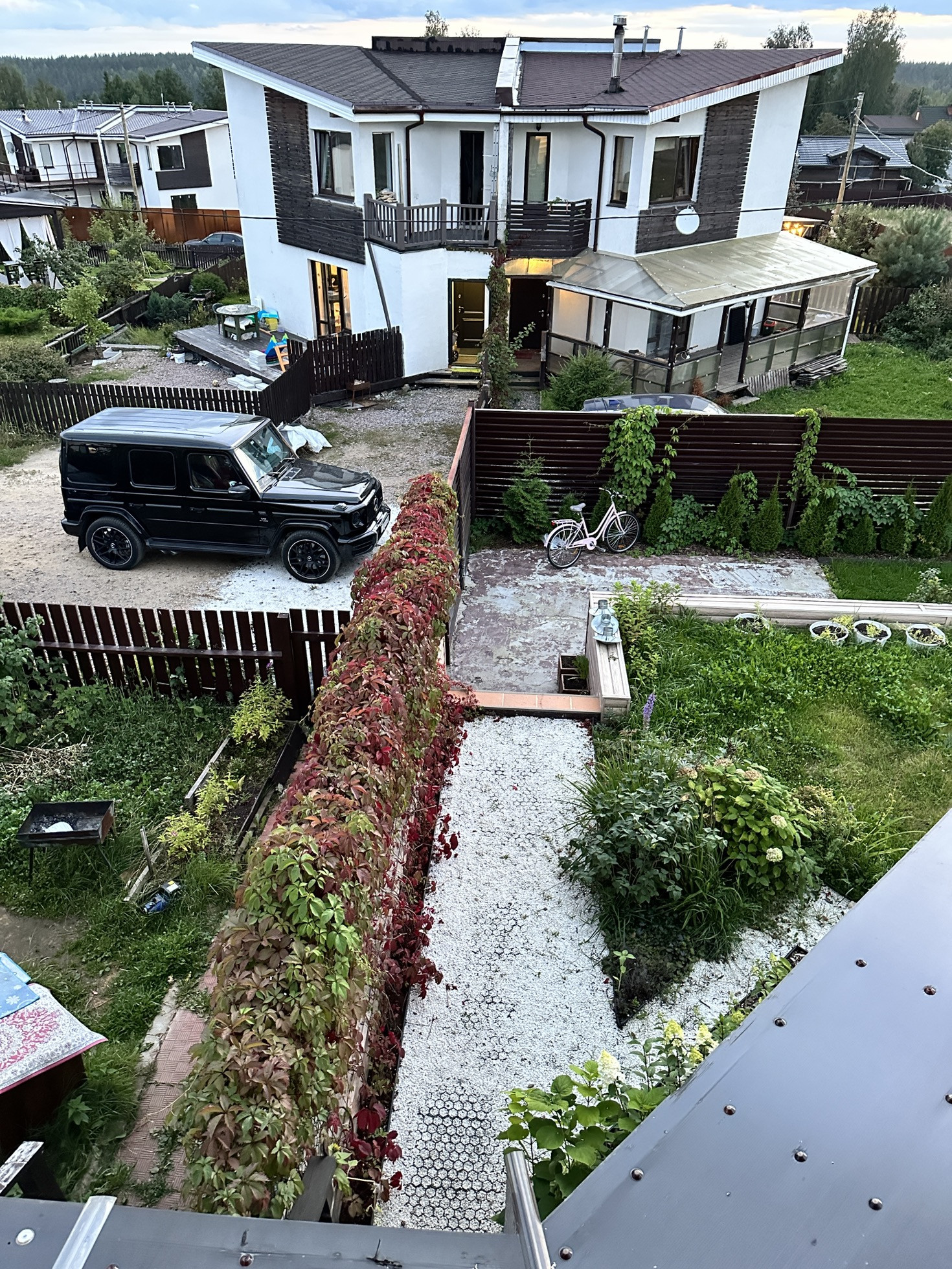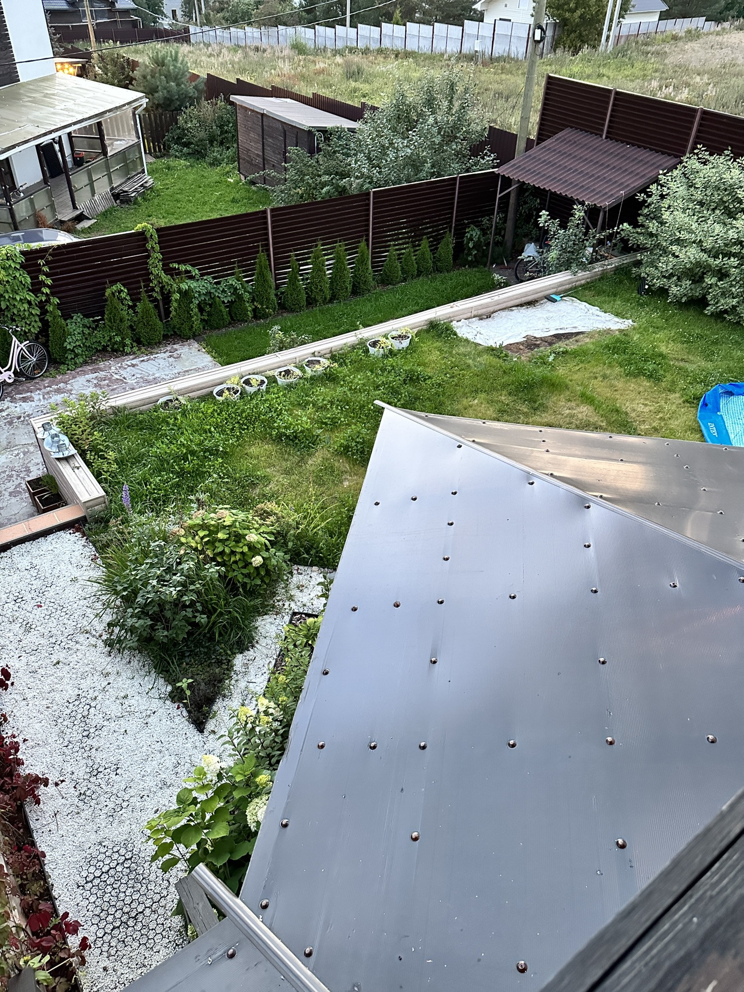 Начну с участка, на котором никогда не бывает тени. Статус: земли сельхоз назначения. Абсолютно солнечная сторона. Участок 4.5 соток ровной формы изначально имел наклон. Мы придумали его разграничить на 2 части: снизу организовали парковочное место (забетонированная площадка) + мангальная зона + плодовые деревья. Участок состоит из нескольких слоев: пгс, песок и покупной плодородный грунт. По всей площади участка проложен мощный дренаж, вода никогда не стоит на участке, сухо. Площадка (парковка) сделана по всем правилам с армированием, просто я хотела подровнять еще и сверху подлили тонкий слой чистого цемента с песком и он со временем порушился. Большие ворота имеют съёмную планку для проезда высоких и грузовых авто. Участок огорожен металлическим забором-жалюзи ( 1.5 метра). Забор собран таким образом, что выглядит абсолютно ровным (без перепадов), что задает дополнительную эстетику. Установка такого забора письменно согласована с соседями. Мангальная зона располагается на бетонной площадке, застеленной садовым паркетом из натурального дерева. Представляет собой 2 зоны: для приготовления пищи и для отдыха ☀️ два столика, два стула, передвижной шкафчик. Имеется розетка и освещение. Обратите внимание какое колоритное освещение веранды и мангальной зоны