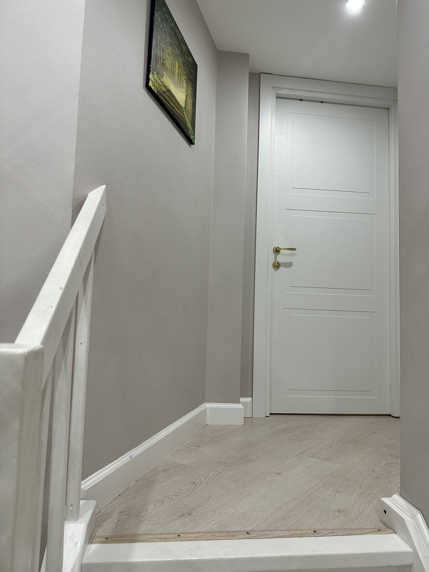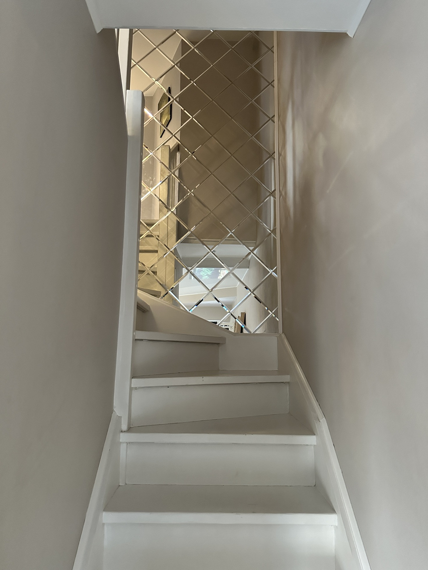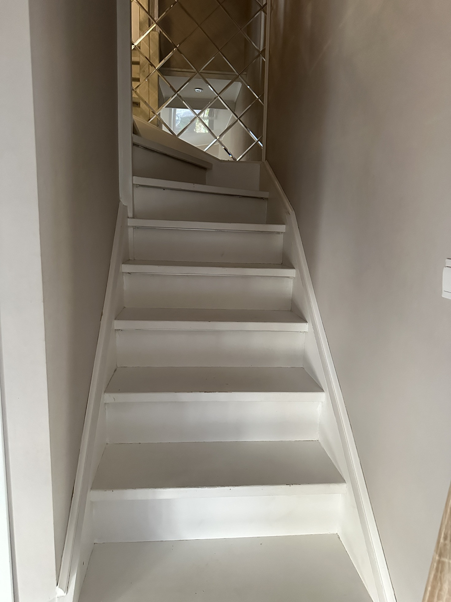 Лестница деревянная, так запланировано для уюта имеет подсветку и датчики движения (сверху и снизу). В момент приближения она начинает гореть постепенно, зажигая ступеньки под ногами. Между этажами большое зеркальное панно, которые визуально увеличивает пространство.