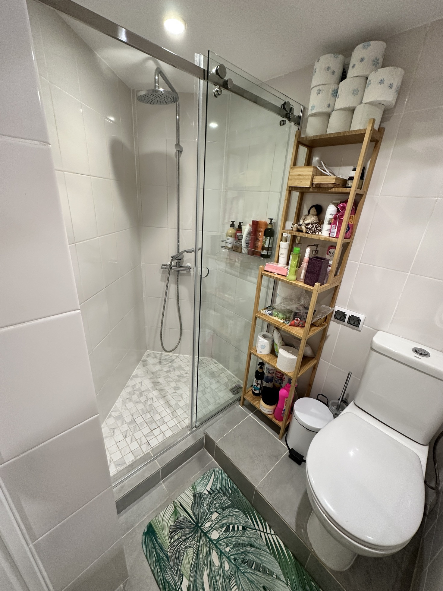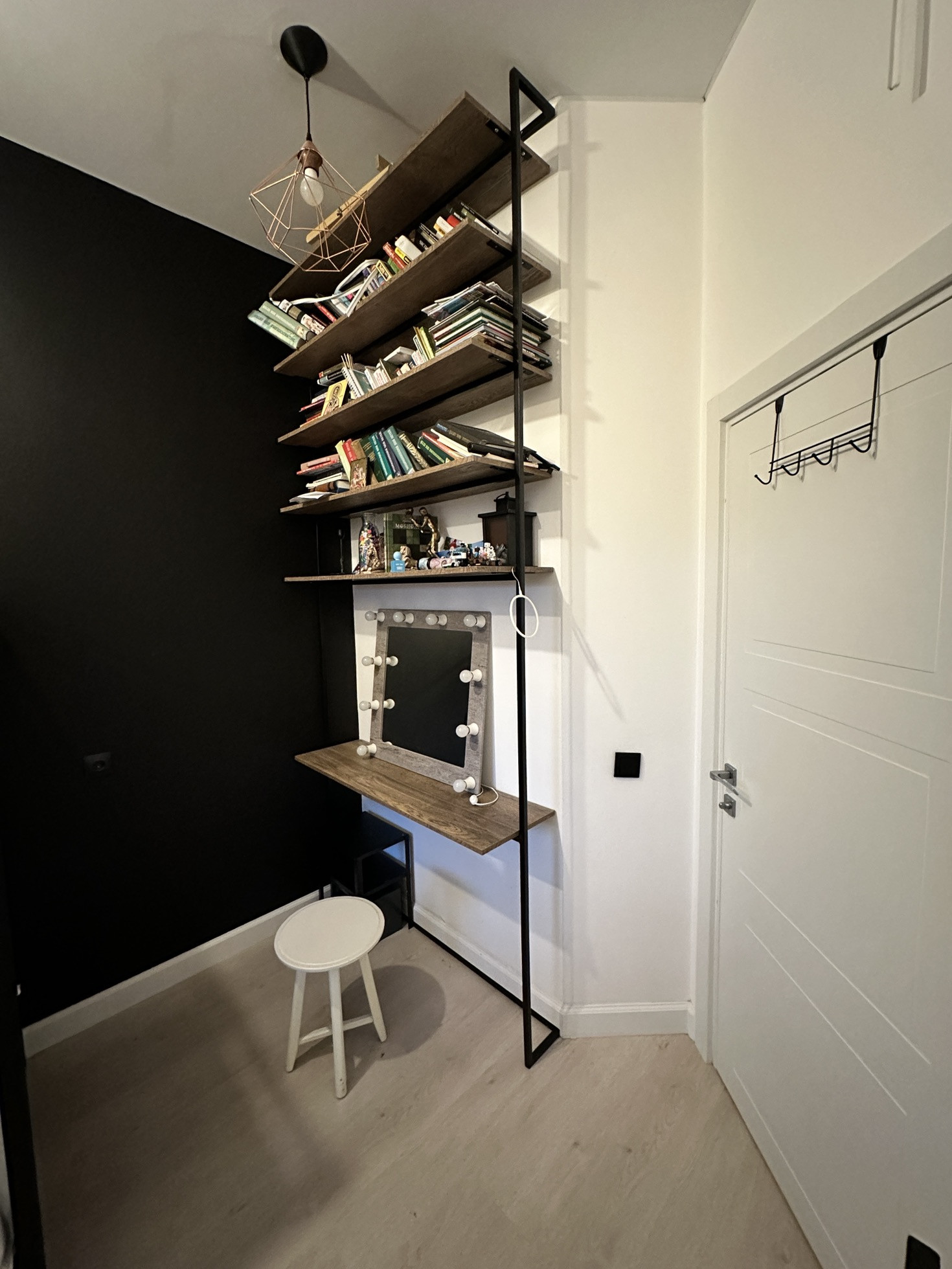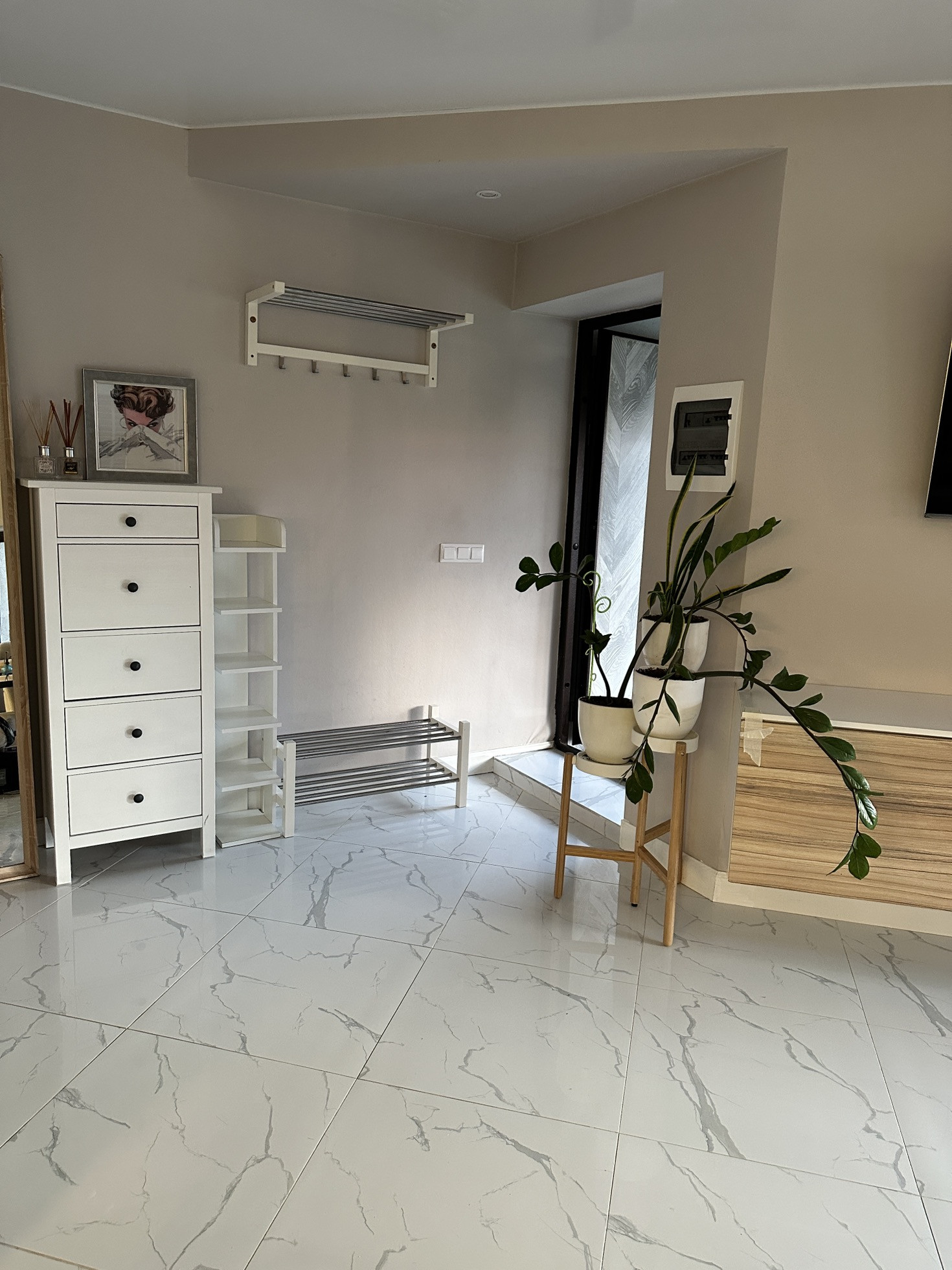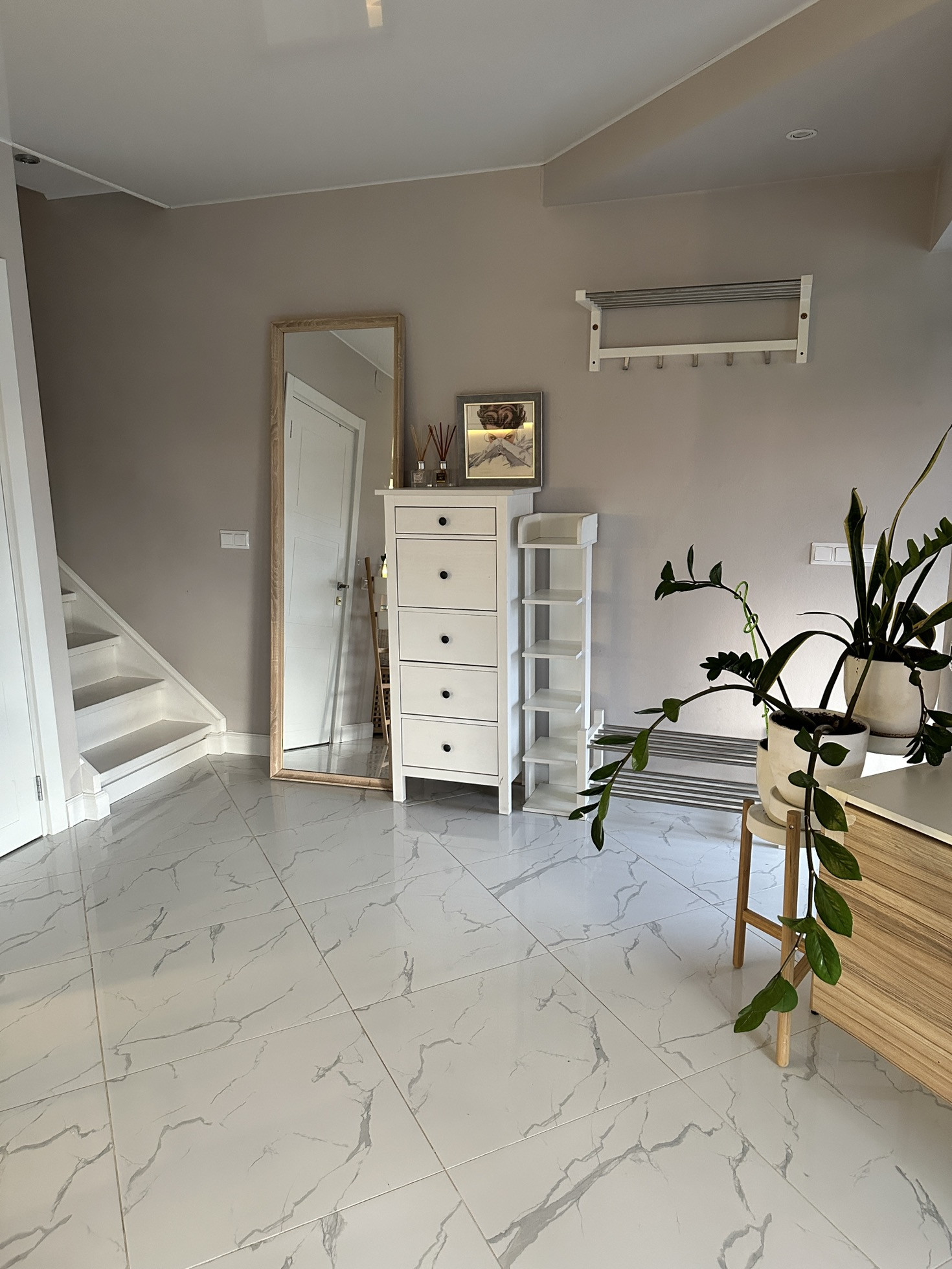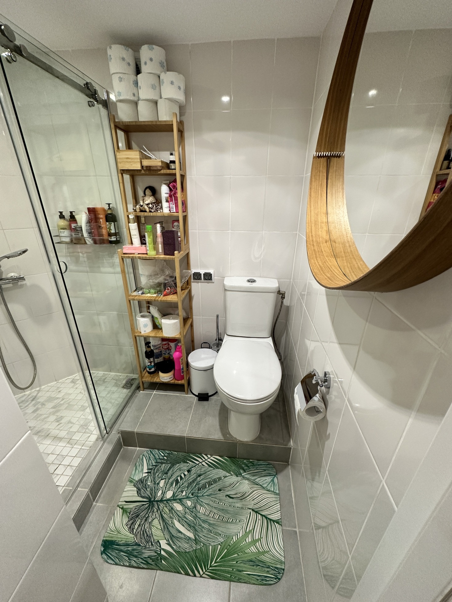 Маленькая прихожая, совмещенный санузел (душевая плюс унитаз) Grohe, как на первом этаже. Кафель итальянский, вентиляция. Имеется большое зеркало и удобный стеллаж. Санузел в скандинавском стиле, очень лаконичный.