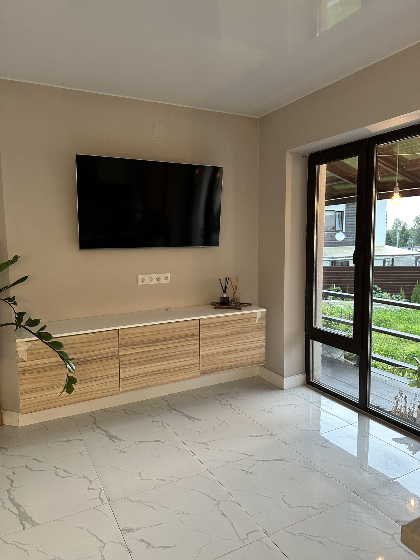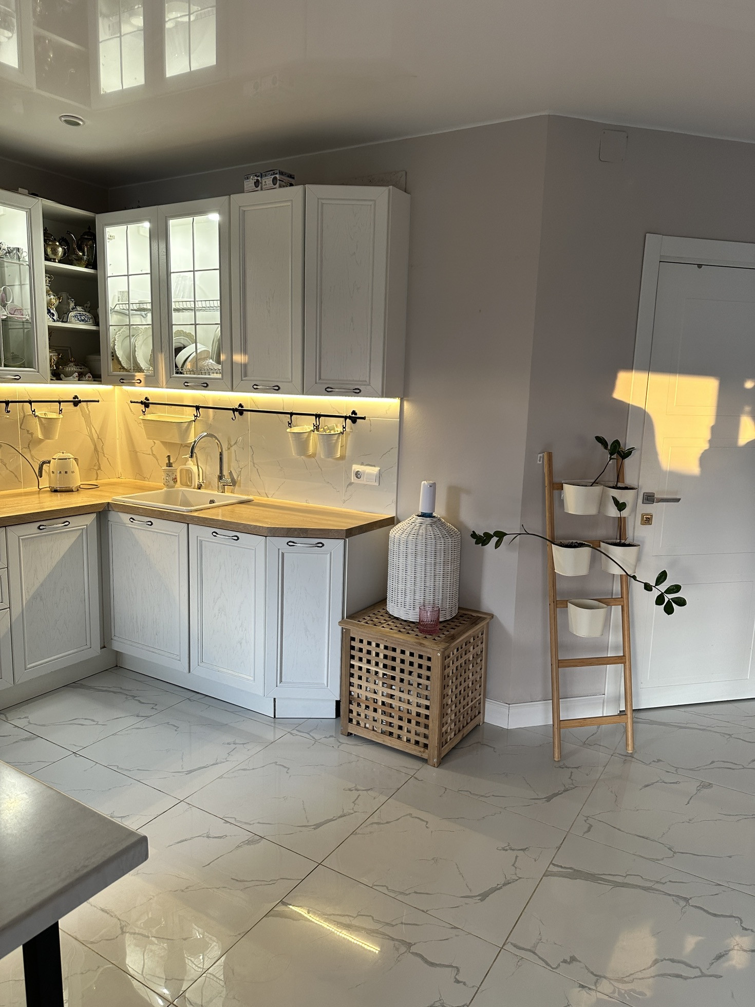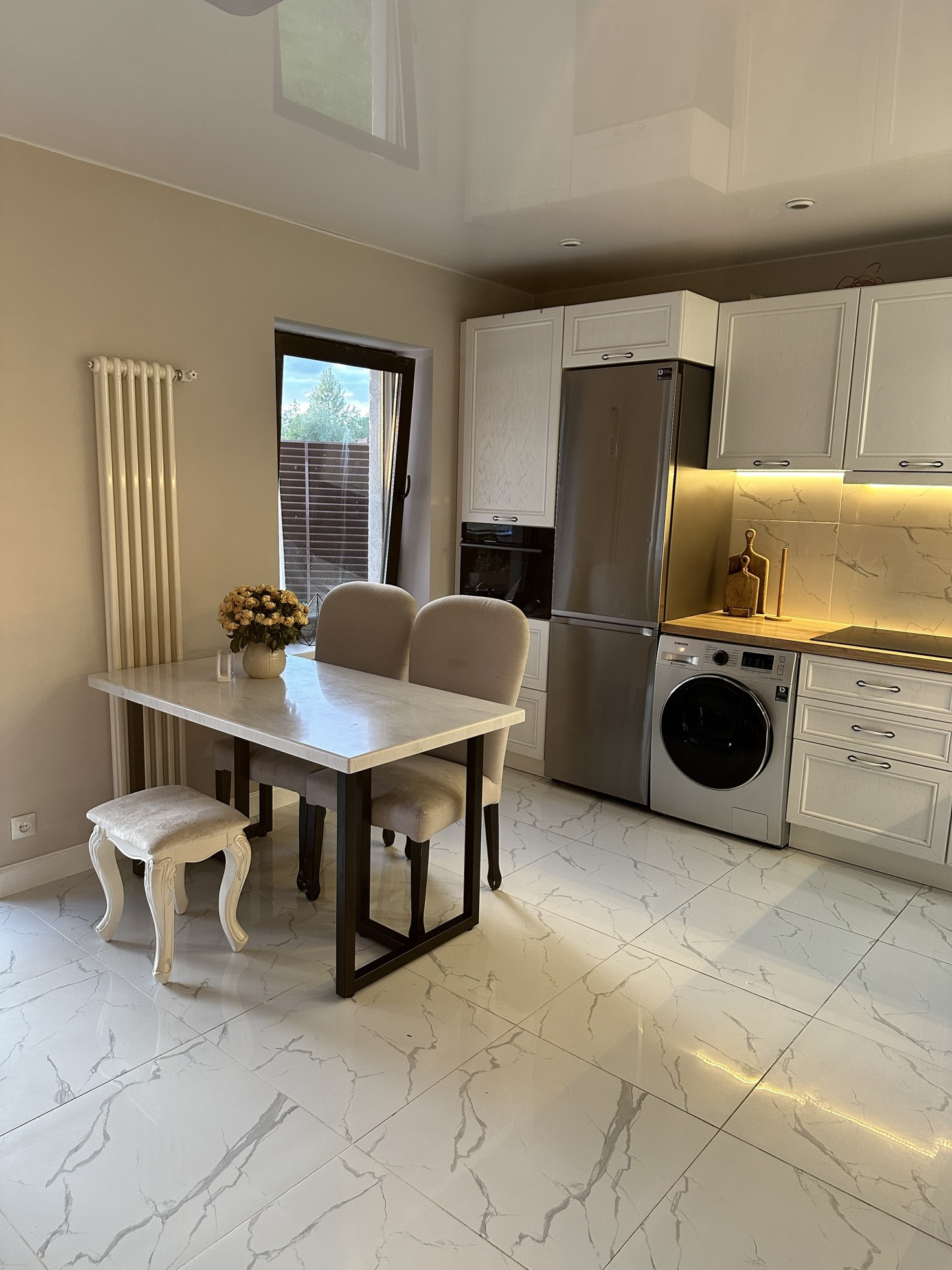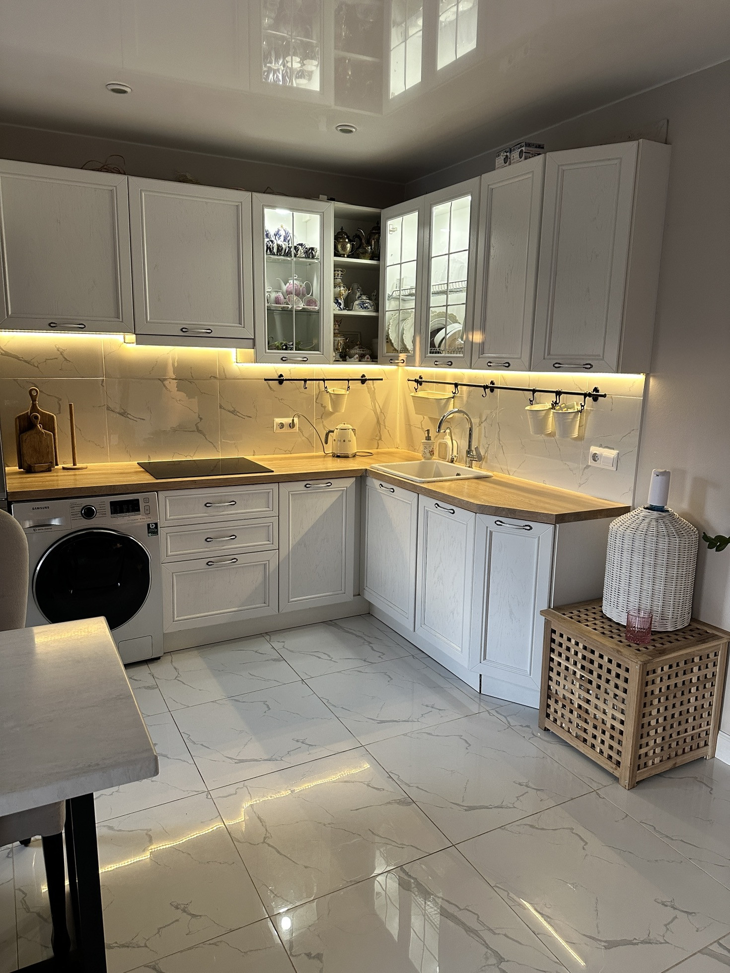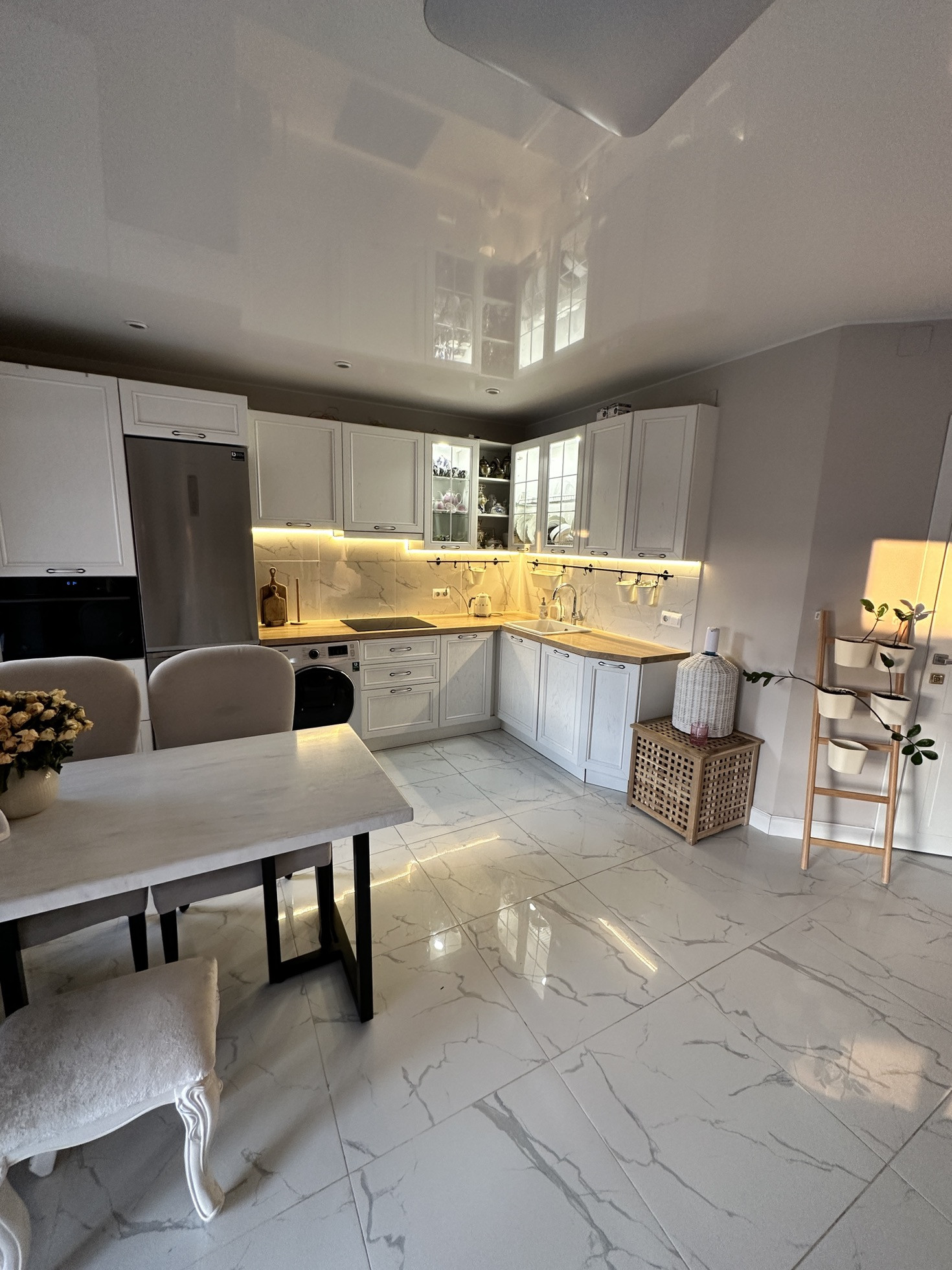Кухня из массива не икея! Вся кухня обошлась мне в 1 млн рублей. Техника вся Самсунг: индукционная плита, посудомоечная машина, духовой шкаф с свч, холодильник. Сантехника на кухне тоже Grohe. Стошница дуб. Стол с каменной столешницей на кованном подстолье, изготавливали так же под заказ. Большой телевизор, мини-прихожая, тумбы под телевизором и комод. Плитка на полу итальянская, потолок натяжной.