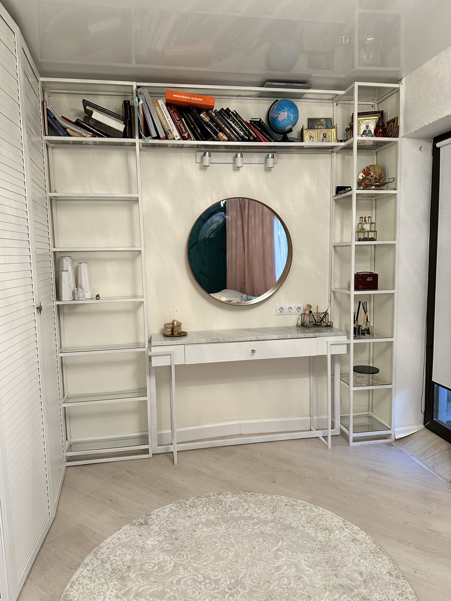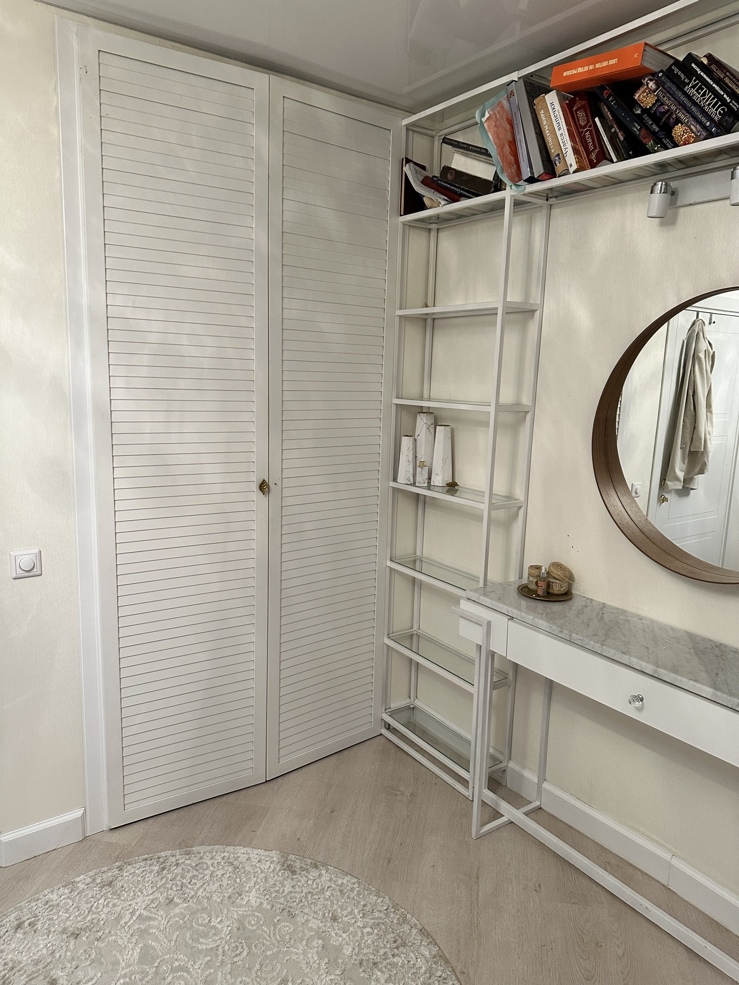 Спальня. Большая двухспальная кровать с высоким изголовьем и ортопедическим матрацем аскона. Кровать имеет внутренний просторный ящик, колотый открывается с помощью удобных газолифтов. Во всю стену под заказ изготовили удобнейшую конструкцию (стеллаж) с туалетным столиком, столешница у которого из натурального белого мрамора. Используем как библиотеку. Комната имеет выход на балкон на полу балкона лежит специальный уличный паркет из дерева. На балконе есть плетеное кресло для теплых Осенних вечеров с пледом. Так же есть большая полка под цветы и декор. Теперь самое интересное. В комнате есть гардероб и лестница на чердак из него. Чердак это и есть пол этажа) поэтому 2.5 ☺️ чердак чистый, сухой и просторный. Идеальное пространство для хранения. По фото можно увидеть, что чердак тоже оборудован шкафами, на полу ламинат. В гардеробной дизайнерская полка и вешало, все кованное, большое зеркало.