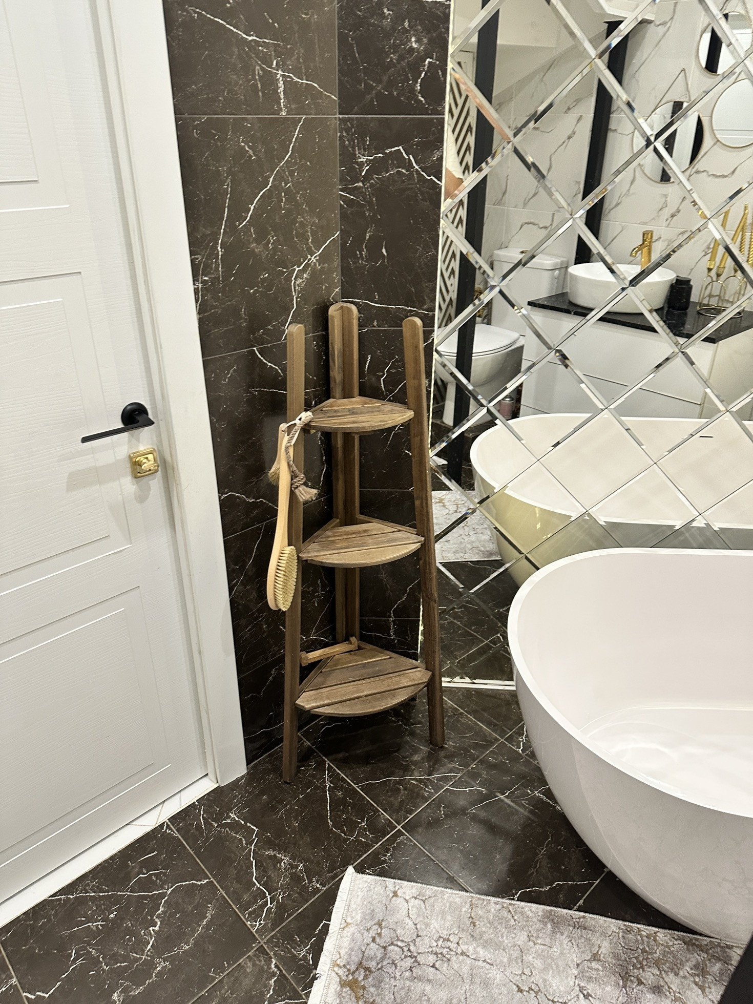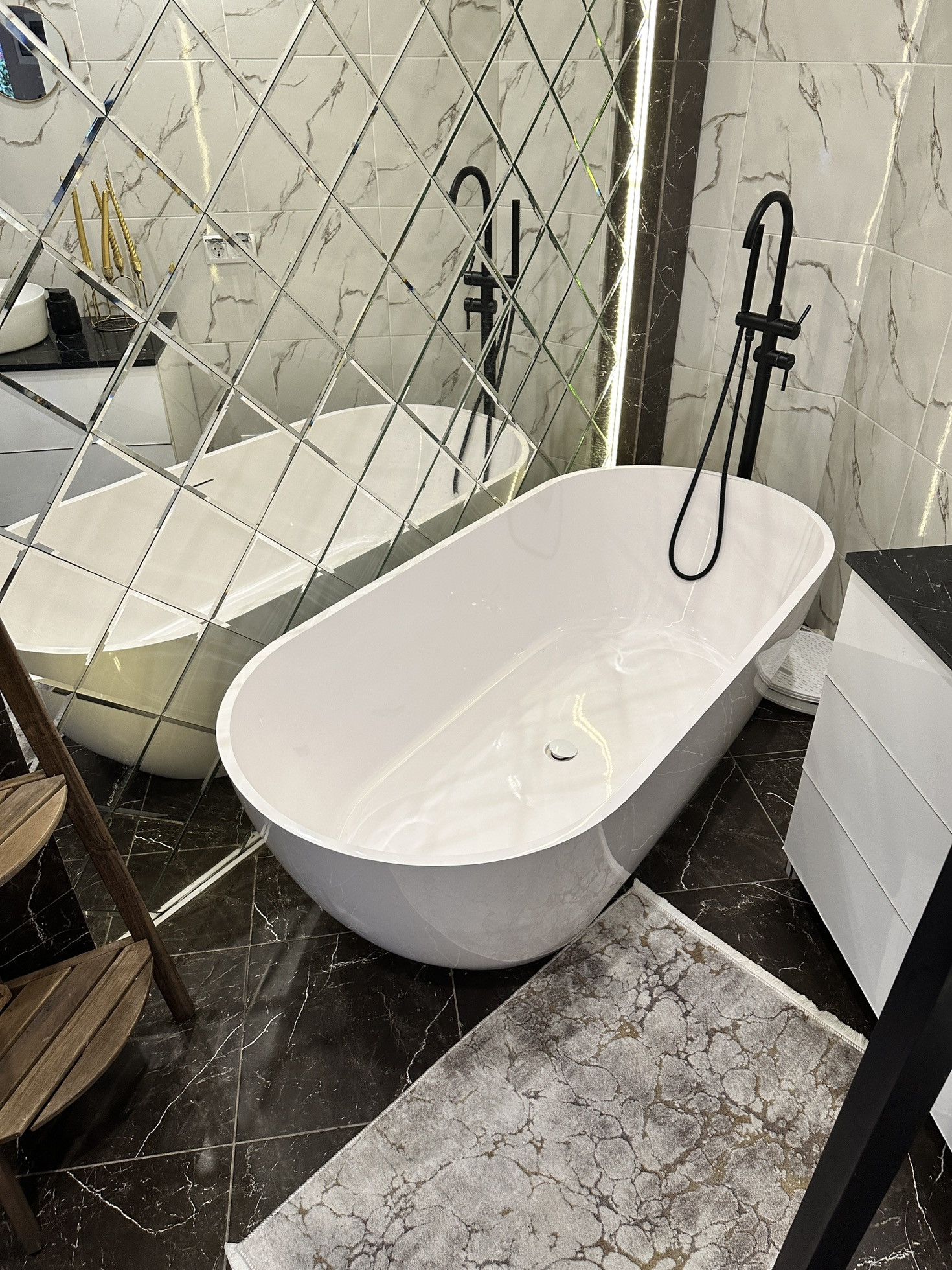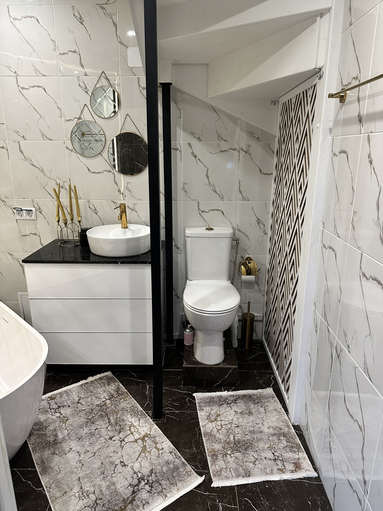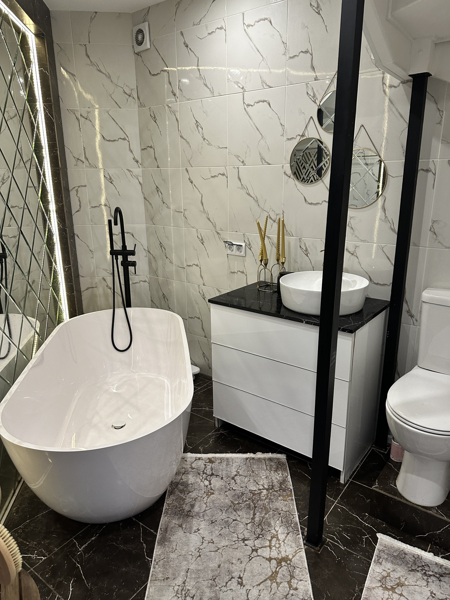 Огромная ванна из натурального мрамора с изливом из Пола, стильное панно с подсветкой, тумба со столешницей из натурального мрамора. Пол и стены итальянский керамогранит. Сантехника вся немецкая, исключительно Grohe. За резной дверью котельная. Там внушительный бойлер (200л) и котел. Унитаз безободковый с бесшумными лифтами на крышке. Двери в доме из дерева, не картонка. Одно дверное полотно без коробки обошлось мне в 64 тыс рублей.