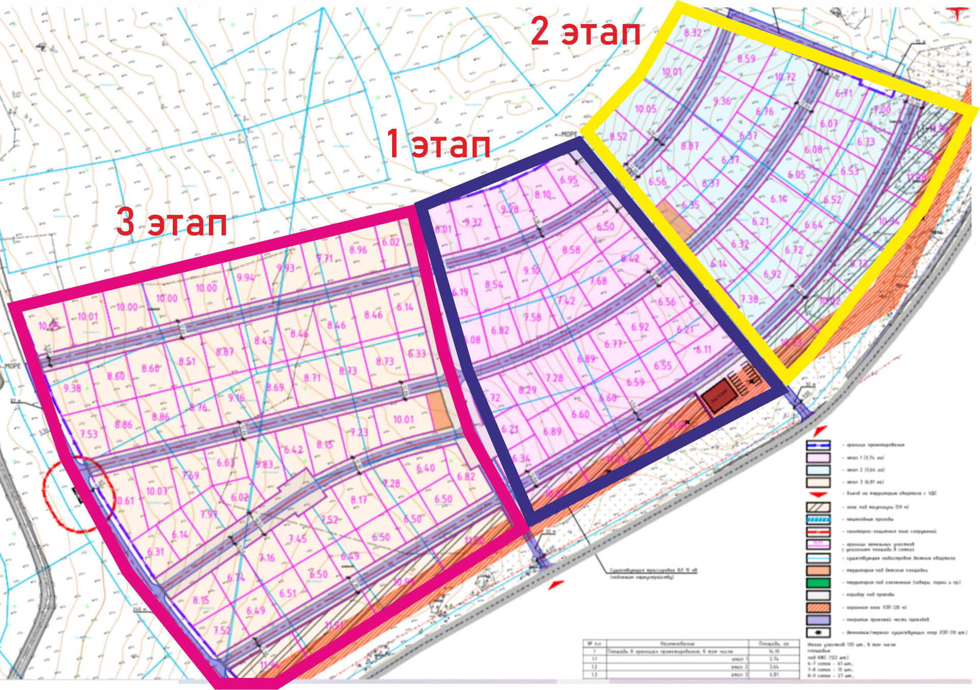Массив целиком 14га, состоит из 121 участка, площадью по 6-8, 8-9 и 10-12 соток. Будут реализовываться в три этапа. Первый этап 31 участок, второй этап 30 участков, третий этап 60 участков.