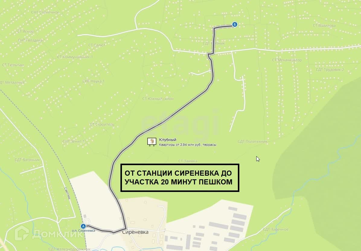 До станции ЖД Сиреневка 20 минут по тропинке через лес.