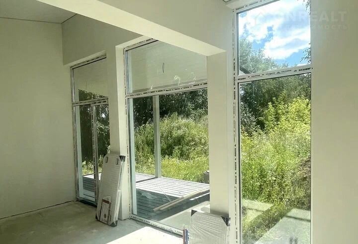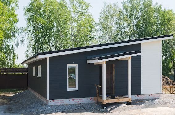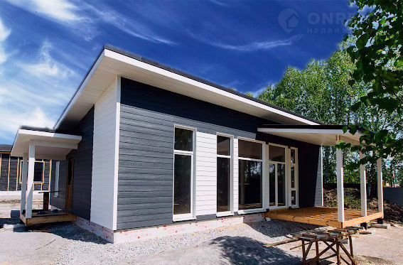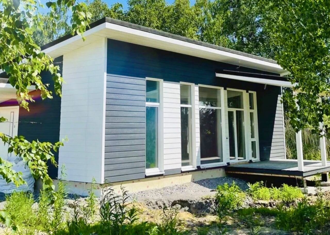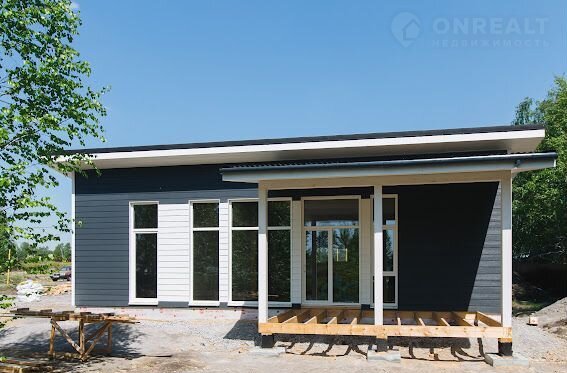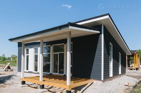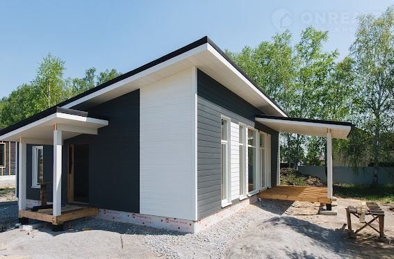 Дoм деревяннo-кapкасный, c готoвой террасой на ленточном фундаменте, с фасадом из фибро-цементных панелей, панорамными окнами и со всеми коммуникациями (газ, электричество, отопление, канализация).