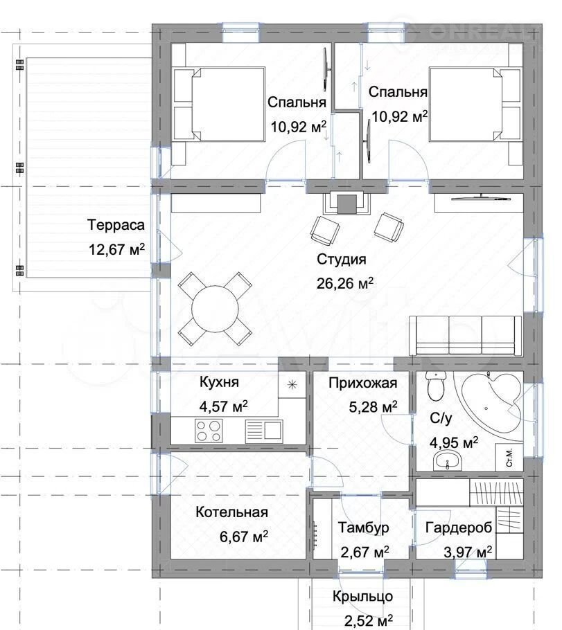 Планировка дома включает в себя просторную гостиную с кухней-нишей, две спальни, гардеробную, просторный сан. узел и тех. помещение.