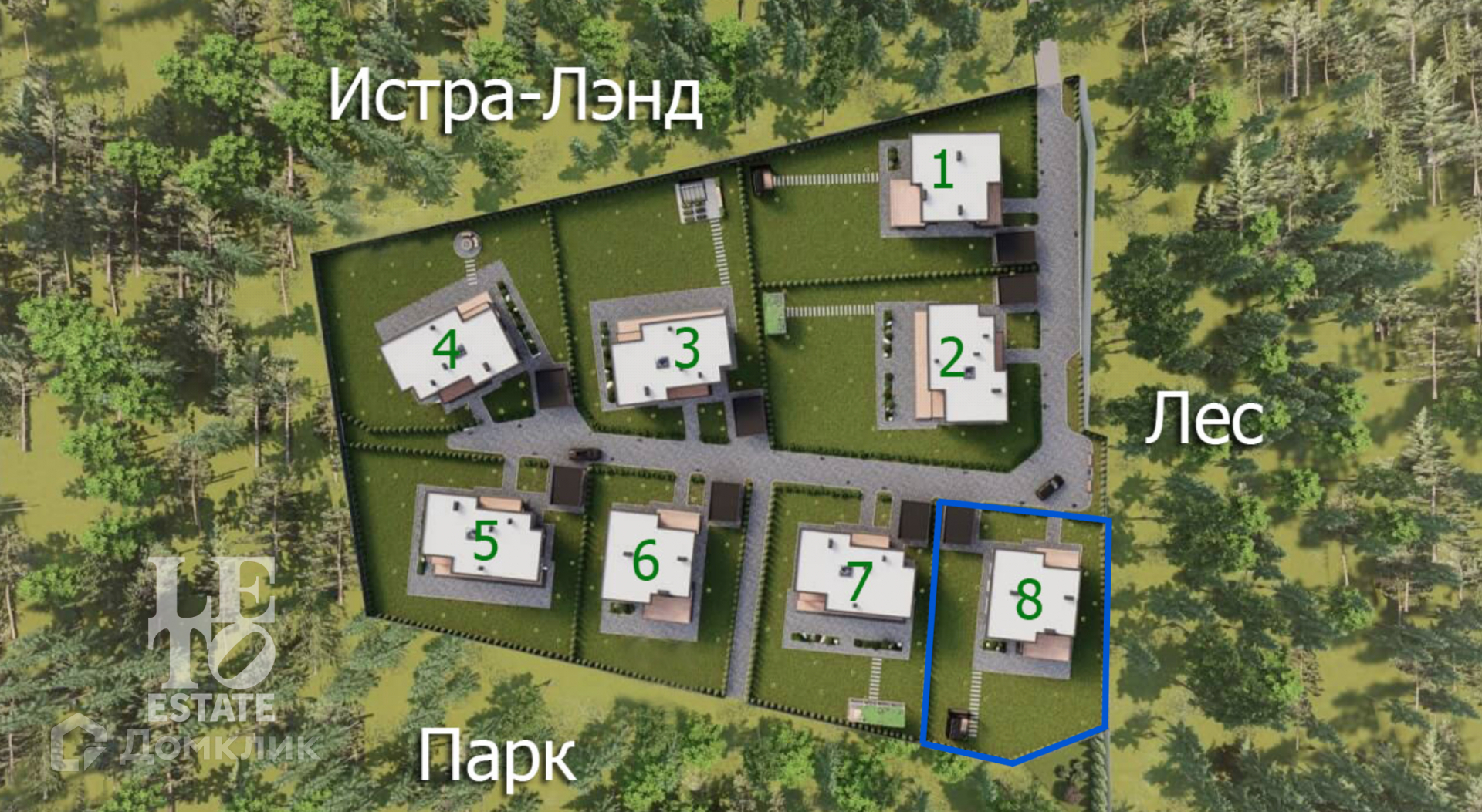 Поселок состоит из 8 участков и 8 домов. Дома построены по двум разным проектам, но их объединяет единый стиль и единое архитектурное решение.