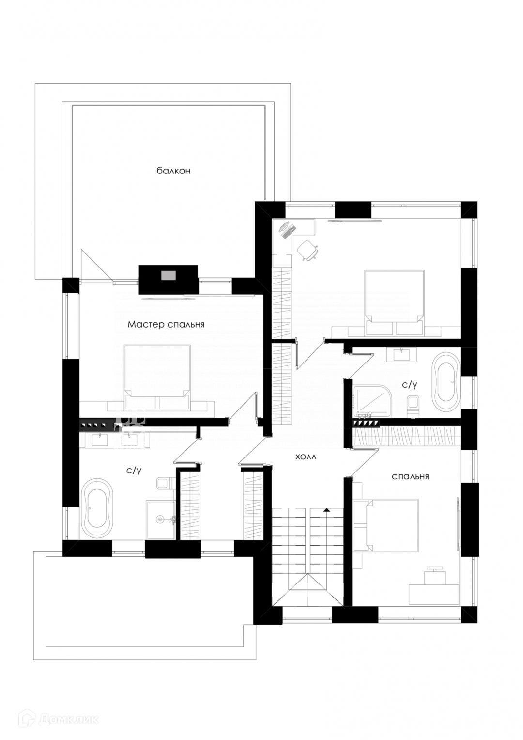 Второй этаж: холл, мастер-спальня, две спальни, санузел, балкон