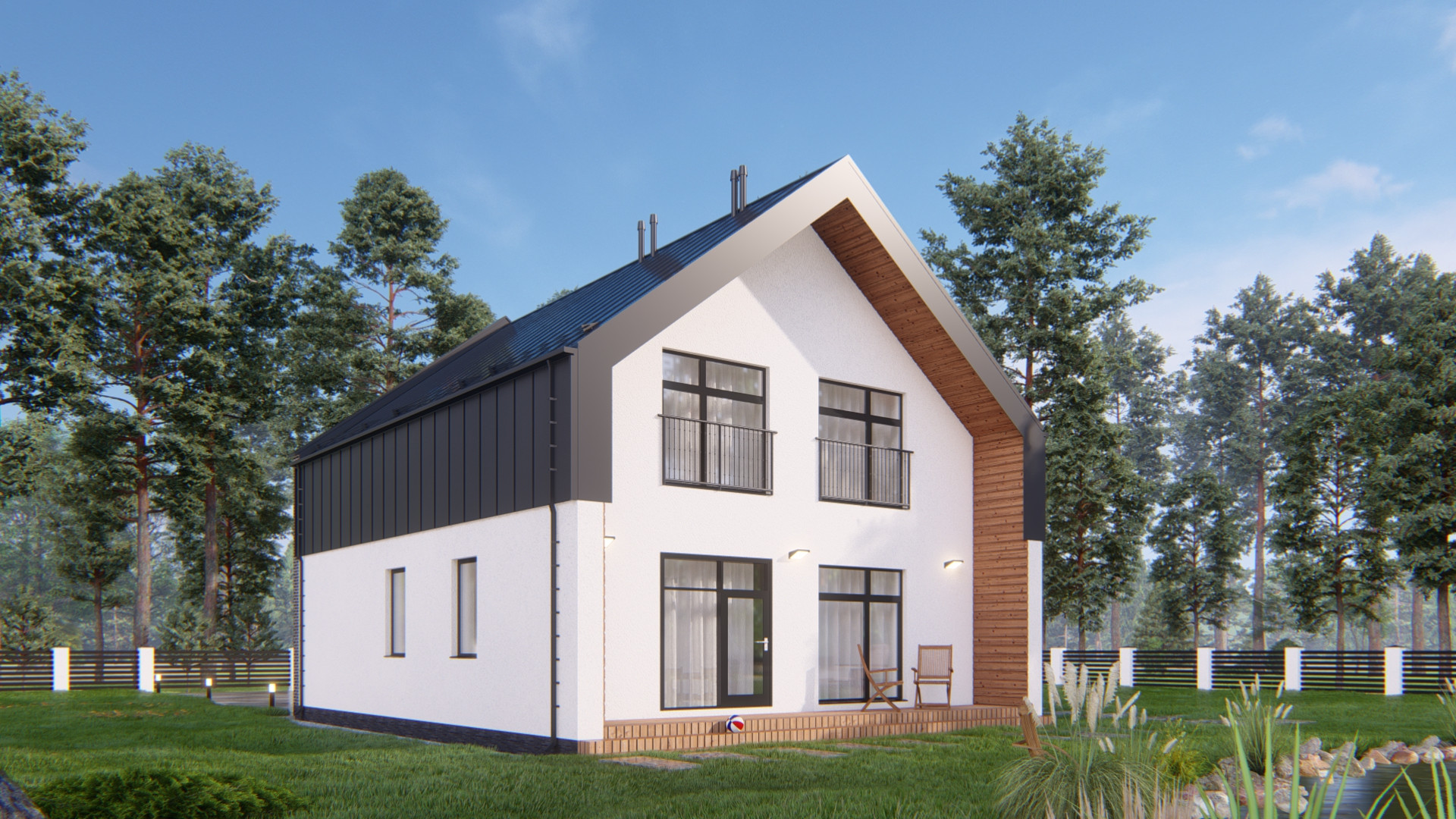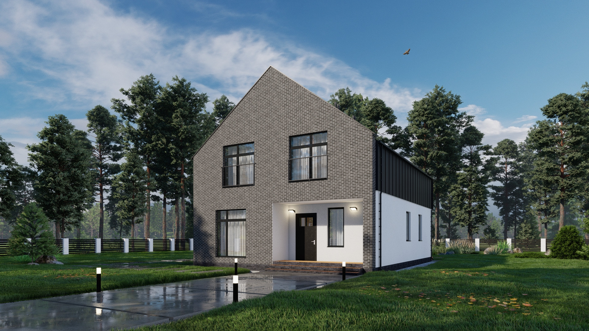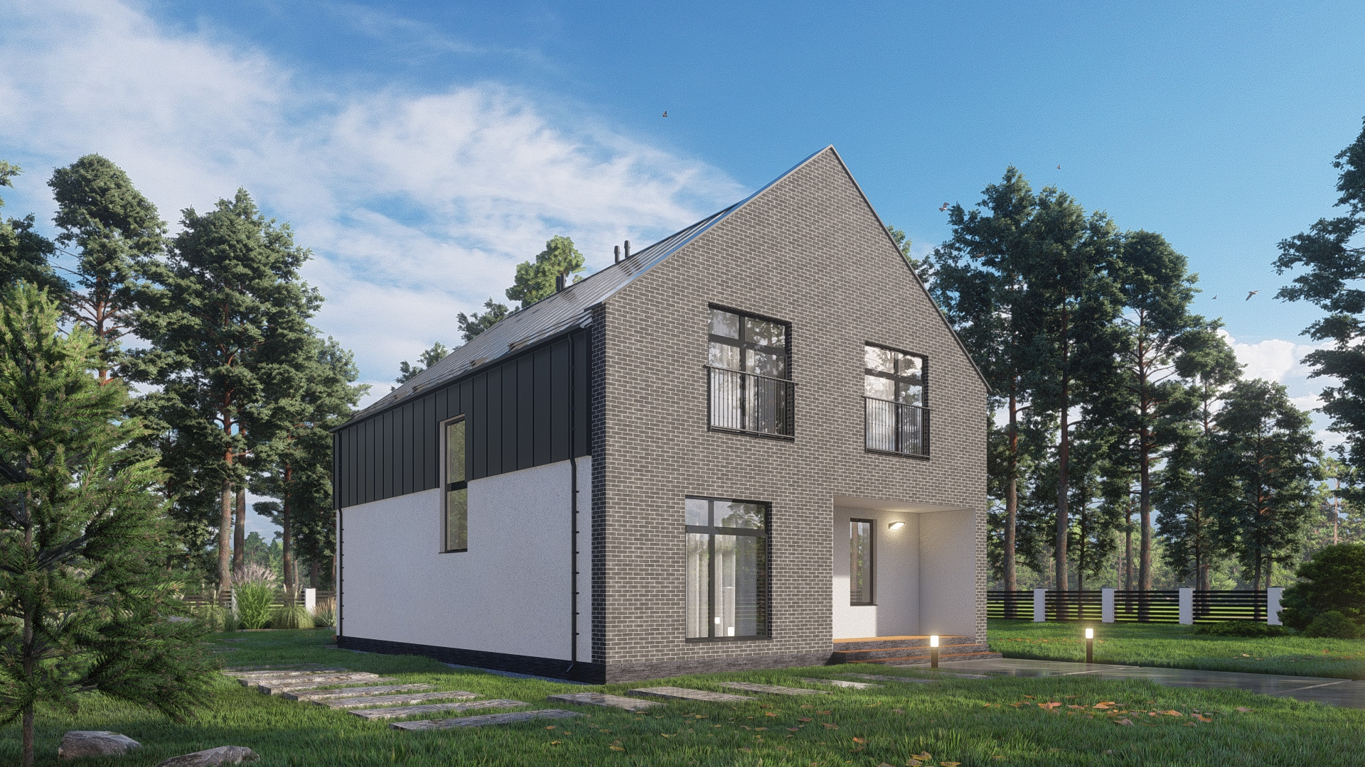Фасад: штукатурка короед с окраской в 2 слоя, планкен лиственница, облицовка кирпичом Terca производства Эстония.