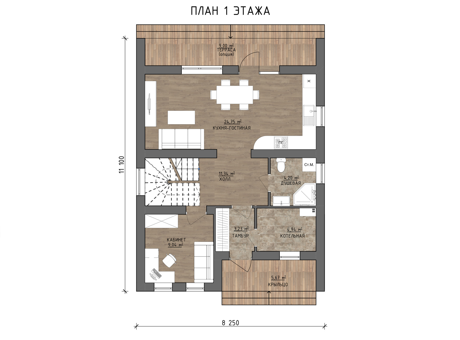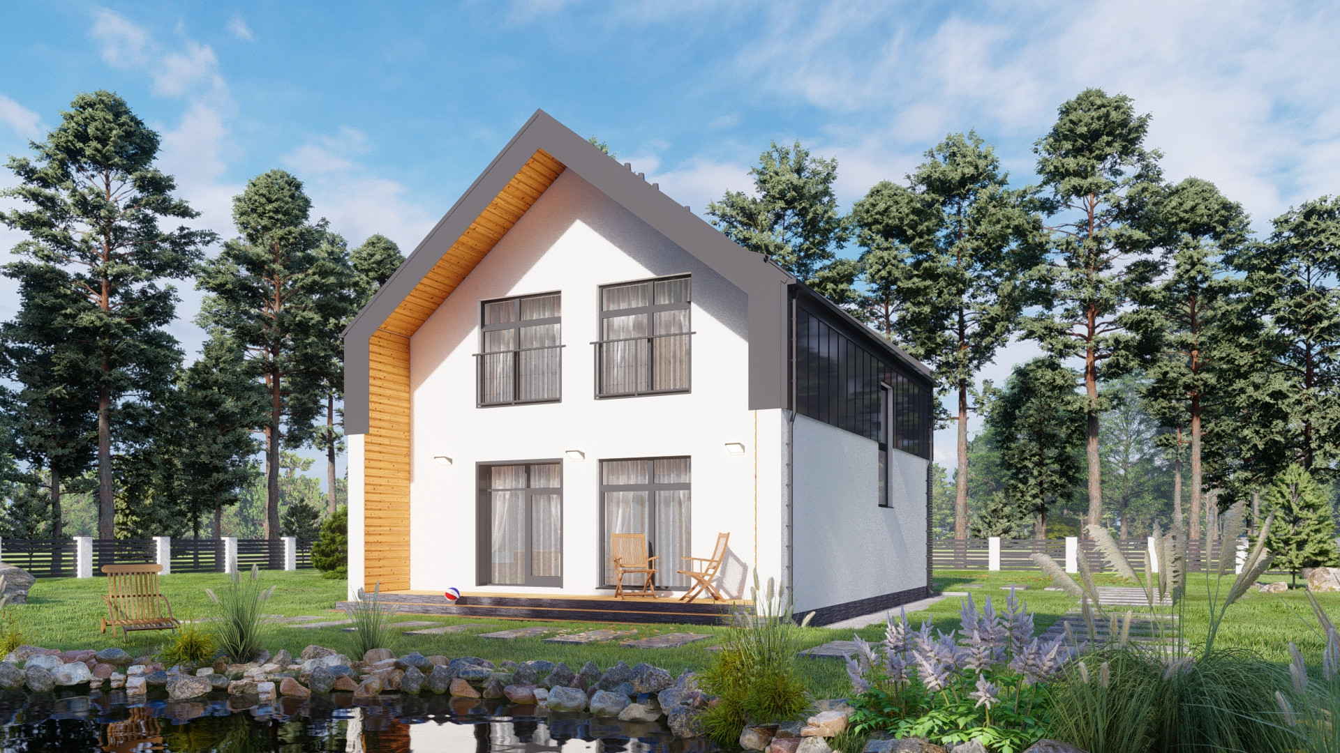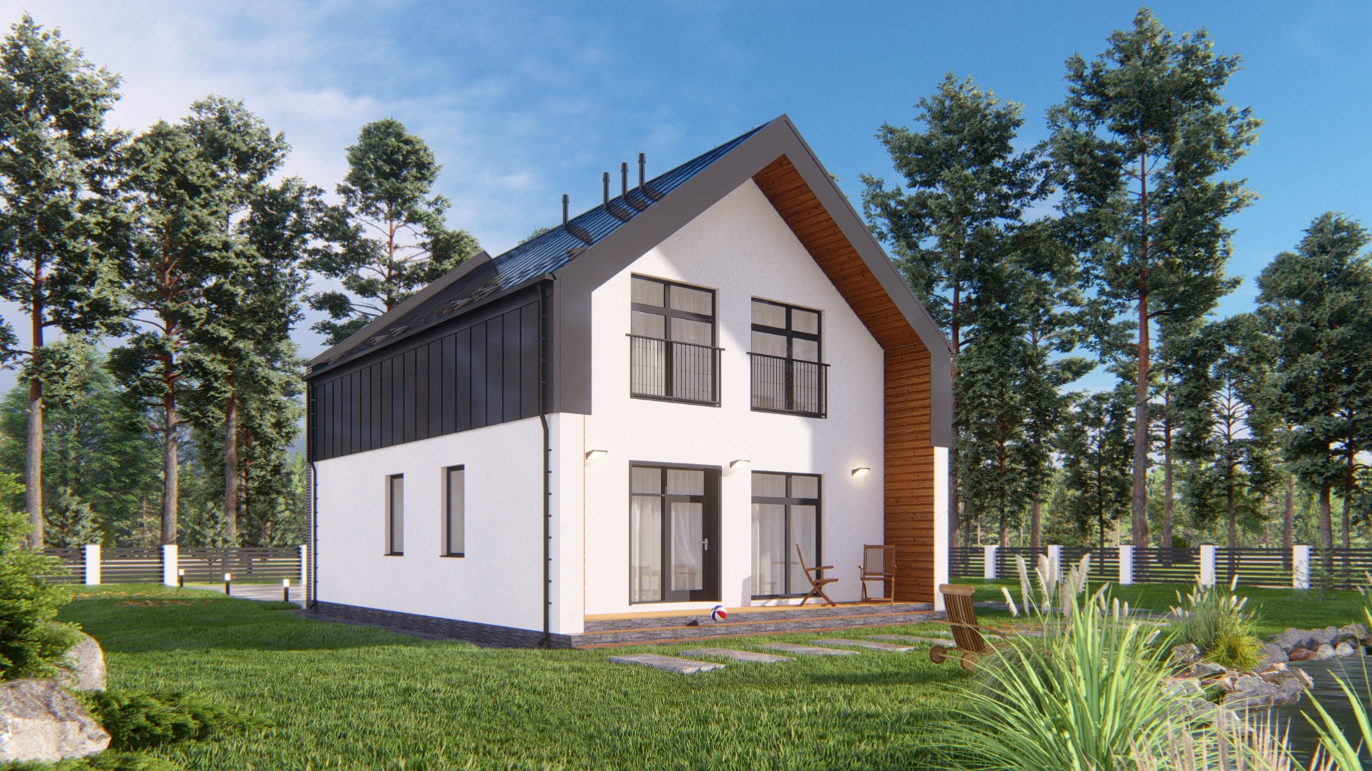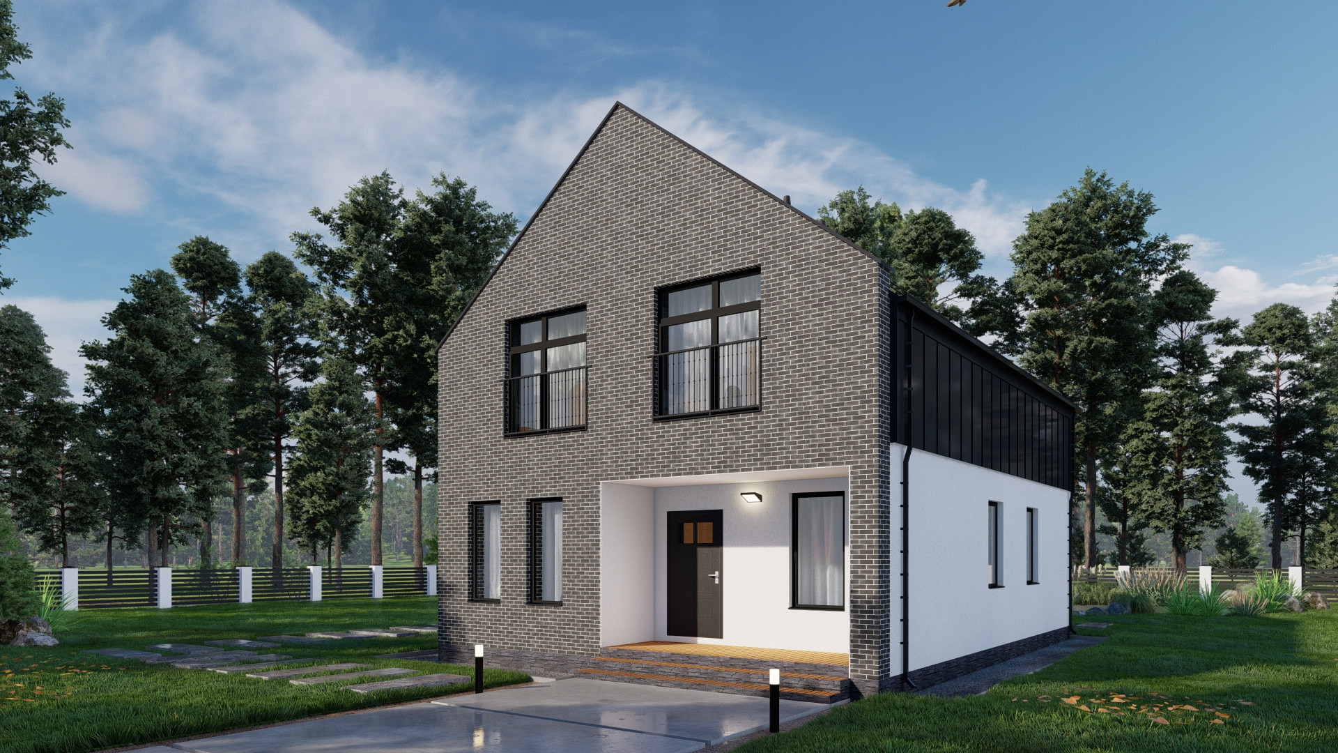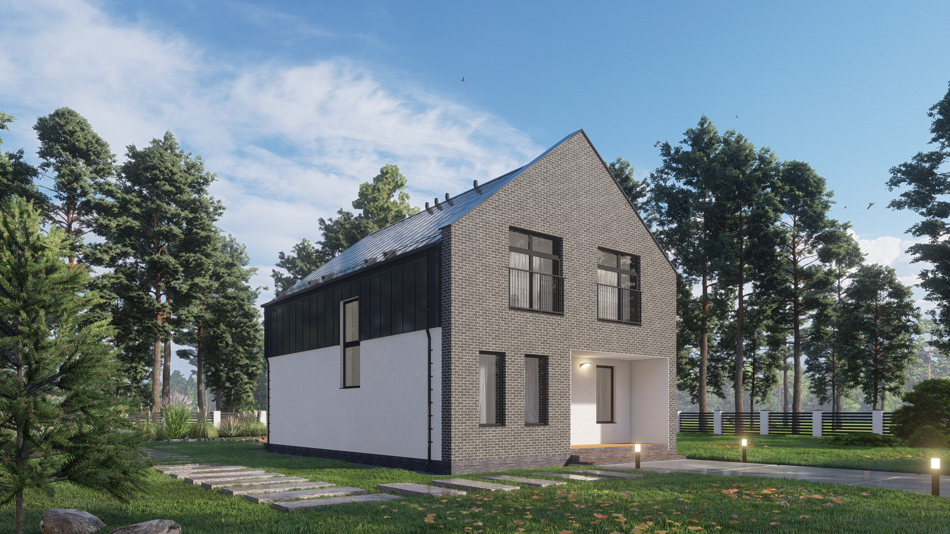 Фасад: штукатурка короед с окраской в 2 слоя, планкен лиственница, облицовка кирпичом Terca производства Эстония.