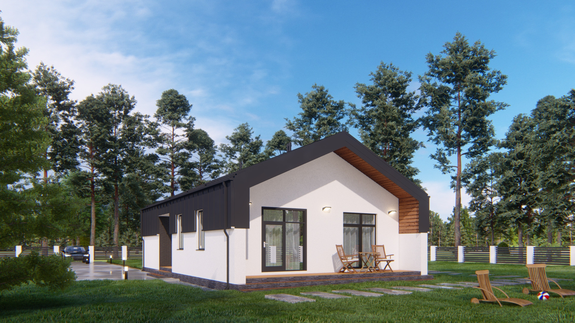 Фасад: штукатурка короед с окраской в 2 слоя, планкен лиственница, облицовка кирпичом Terca производства Эстония.
