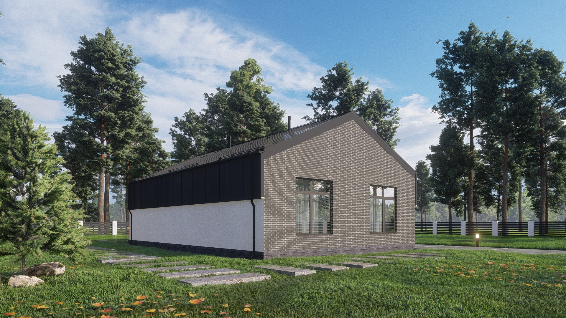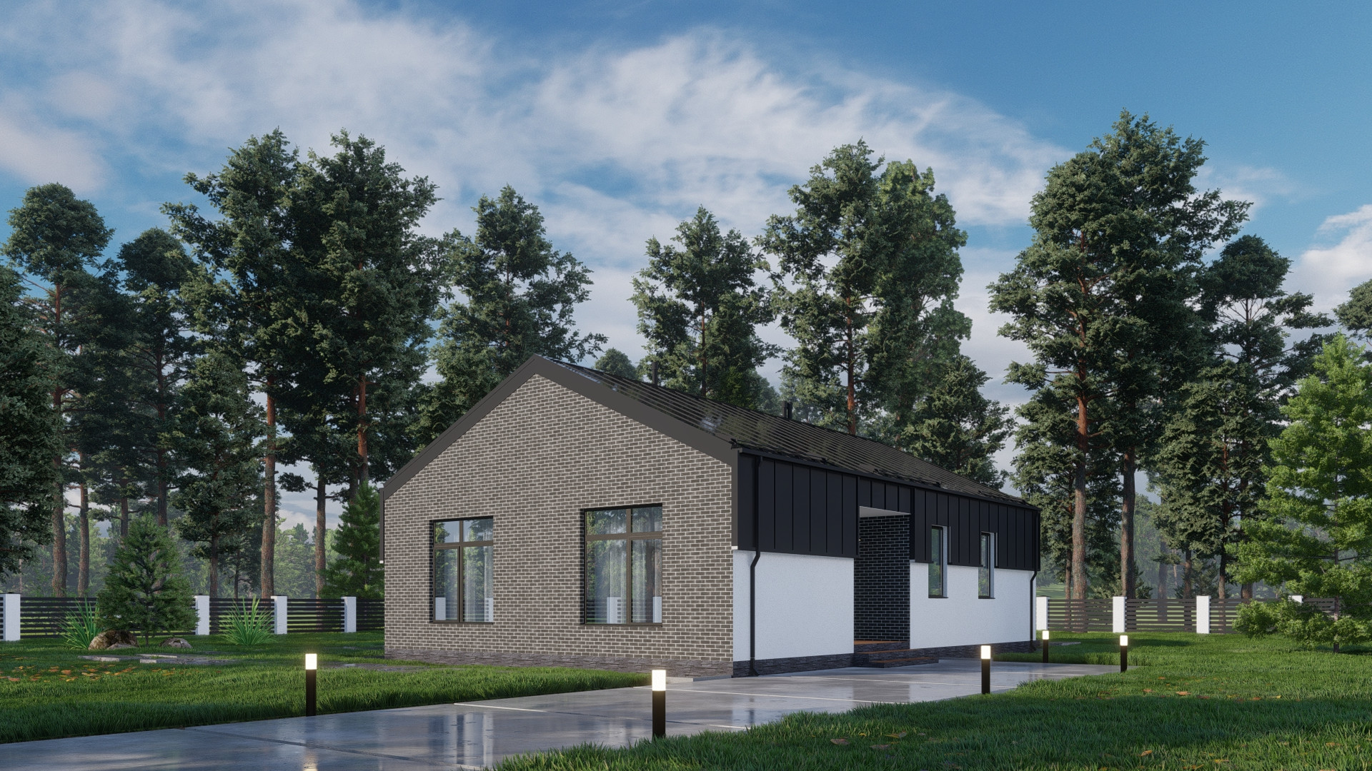 Фасад: штукатурка короед с окраской в 2 слоя, планкен лиственница, облицовка кирпичом Terca производства Эстония.