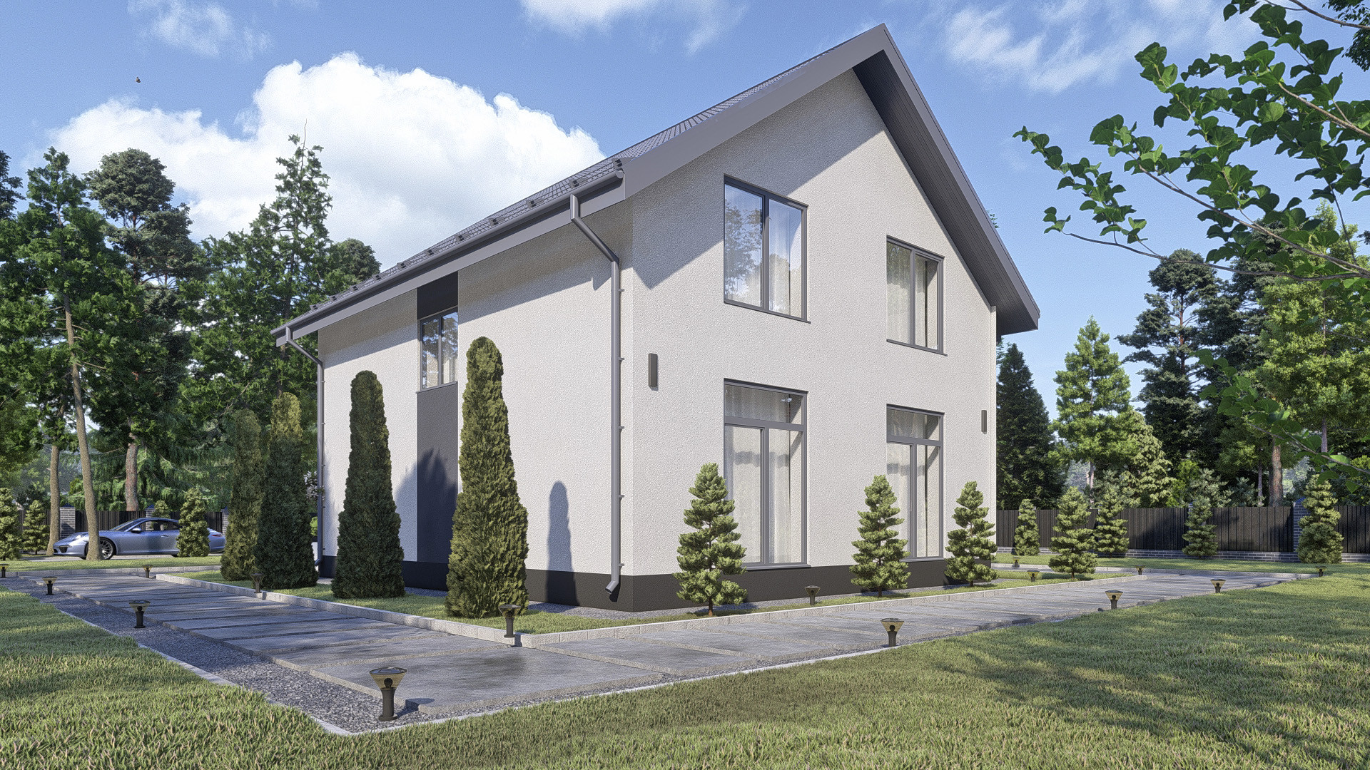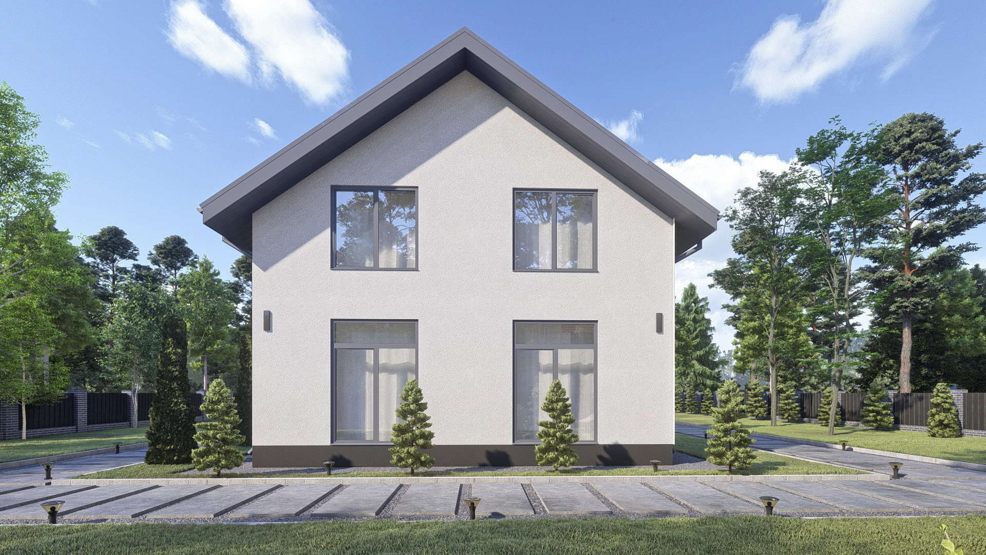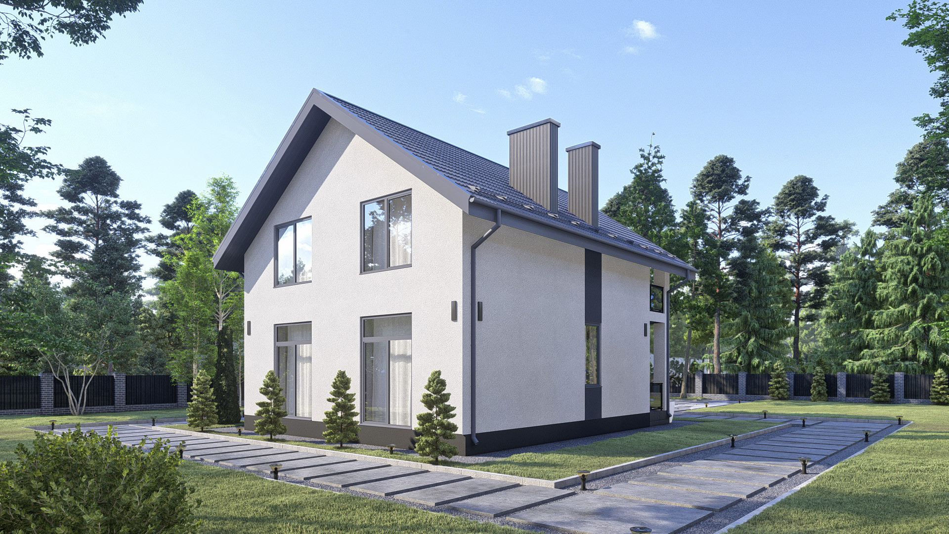 •    Окна: ПВХ профиль 72 мм. с ламинацией антрацитово-серый, стеклопакеты двухкамерные.