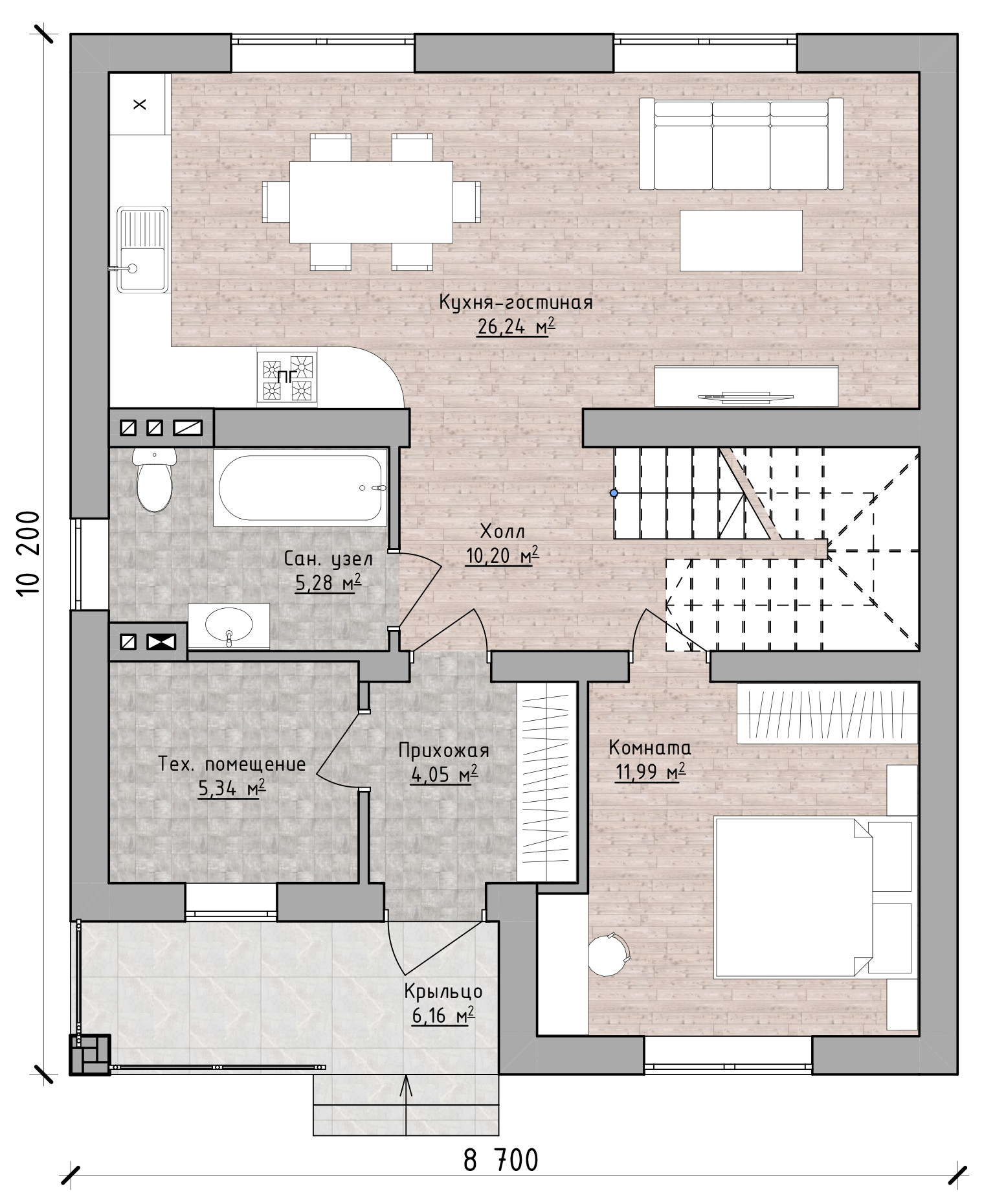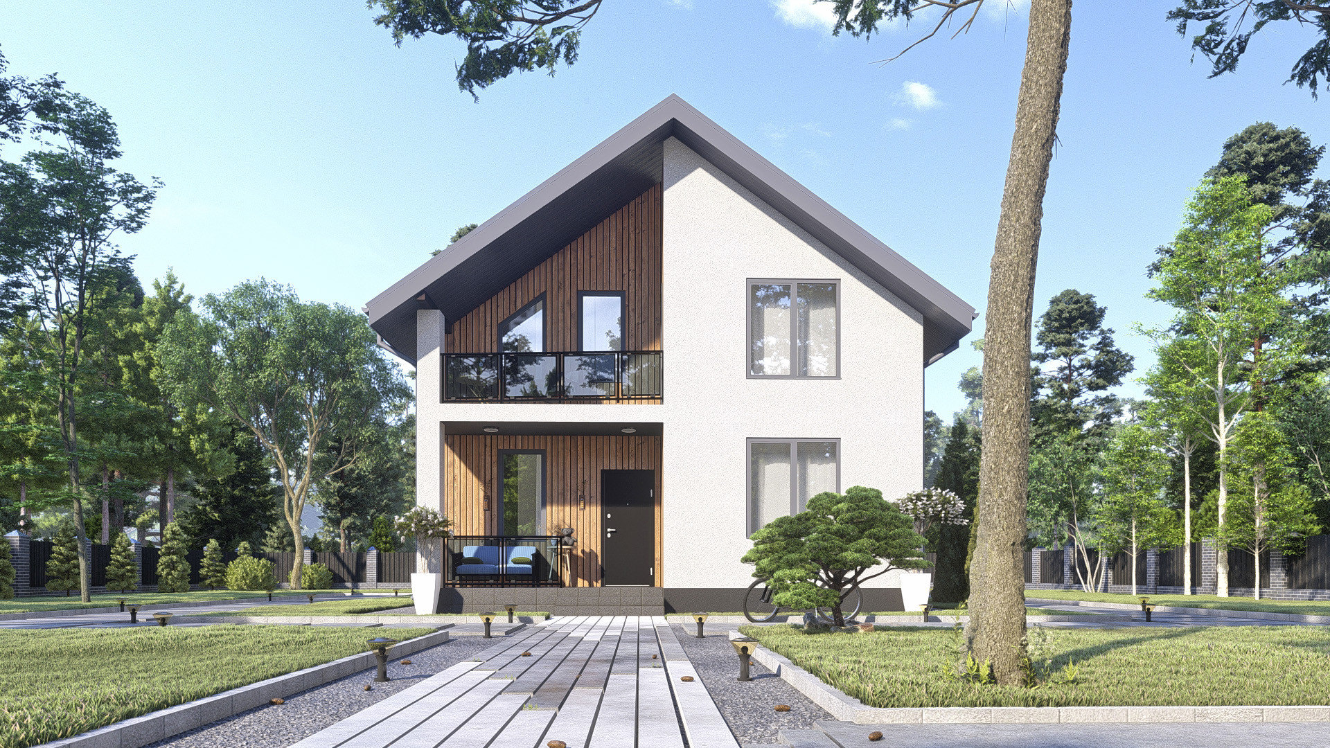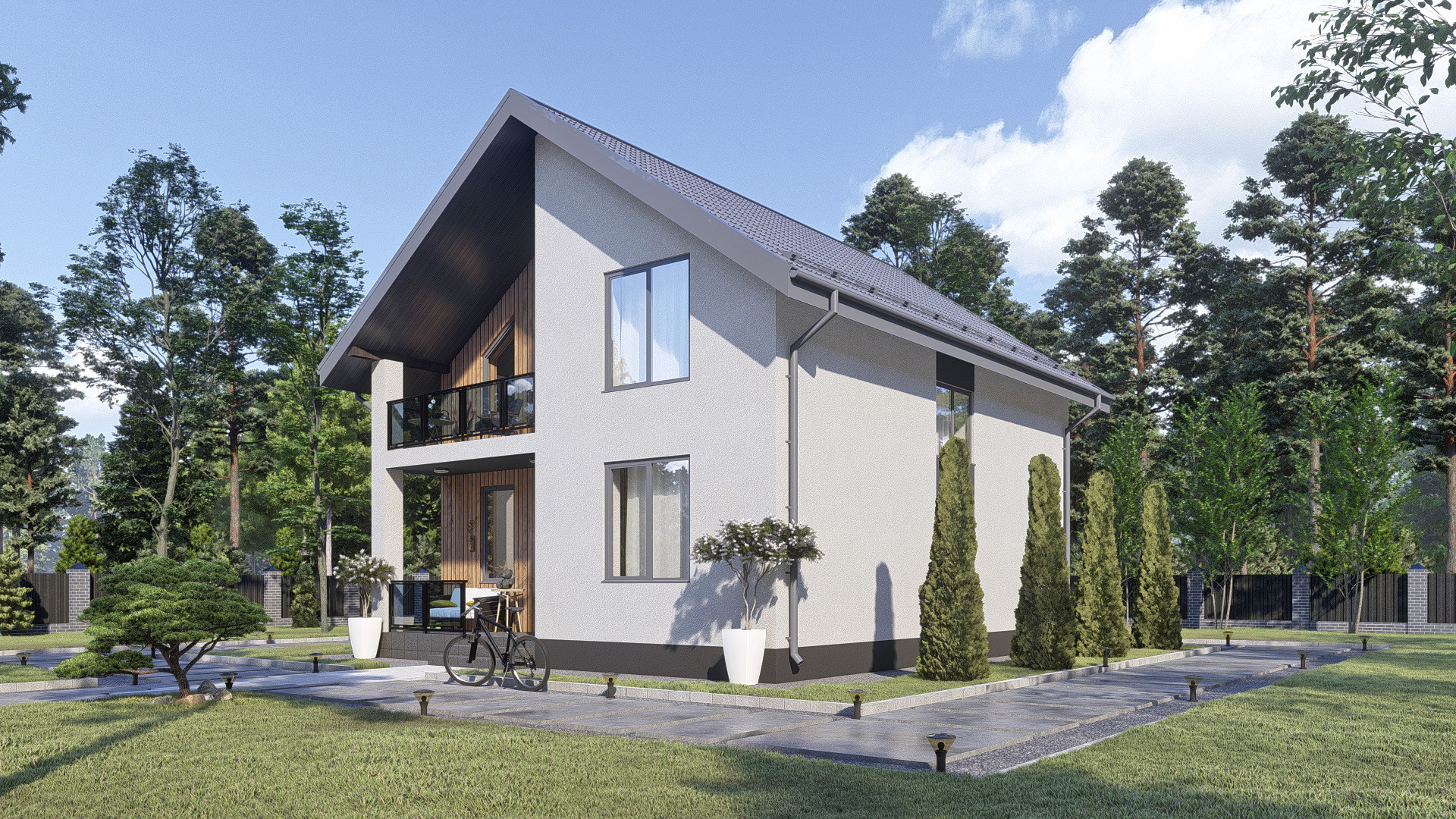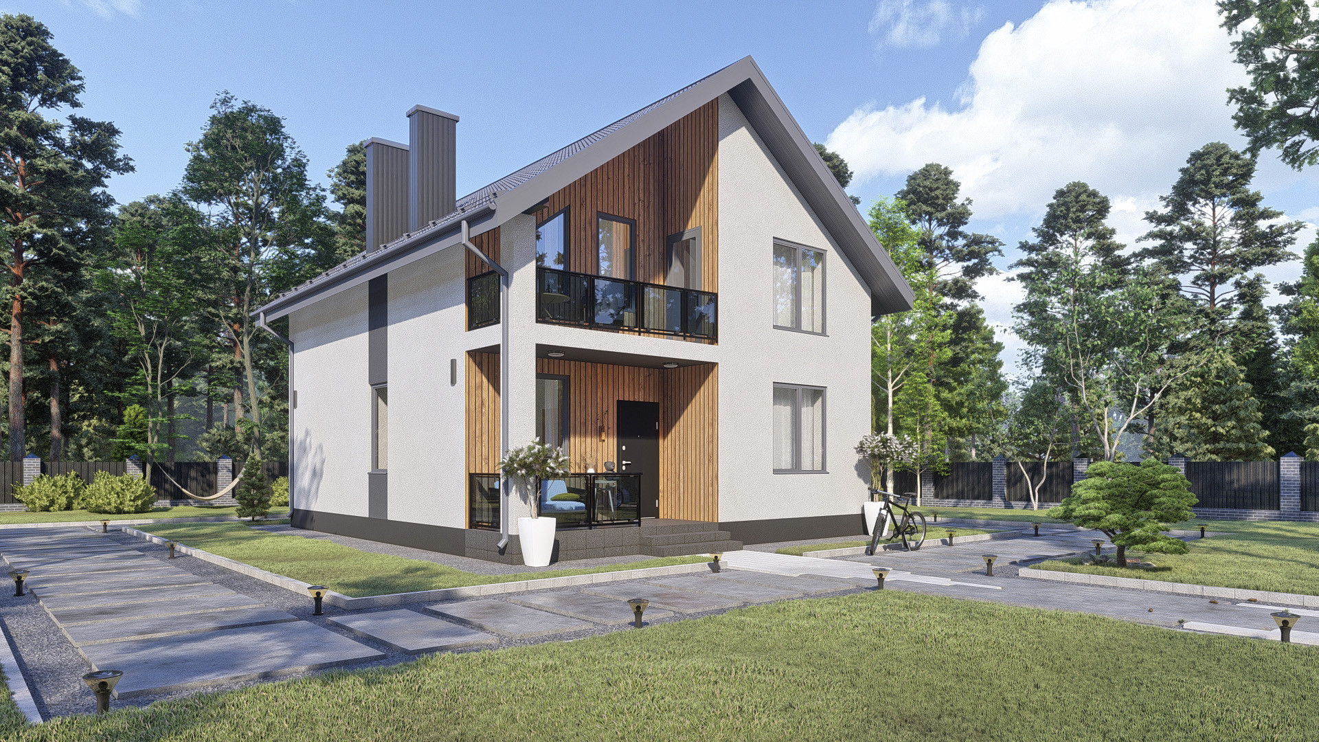 •    Фасад: штукатурка короед с окраской в 2 слоя, планкен лиственница.
